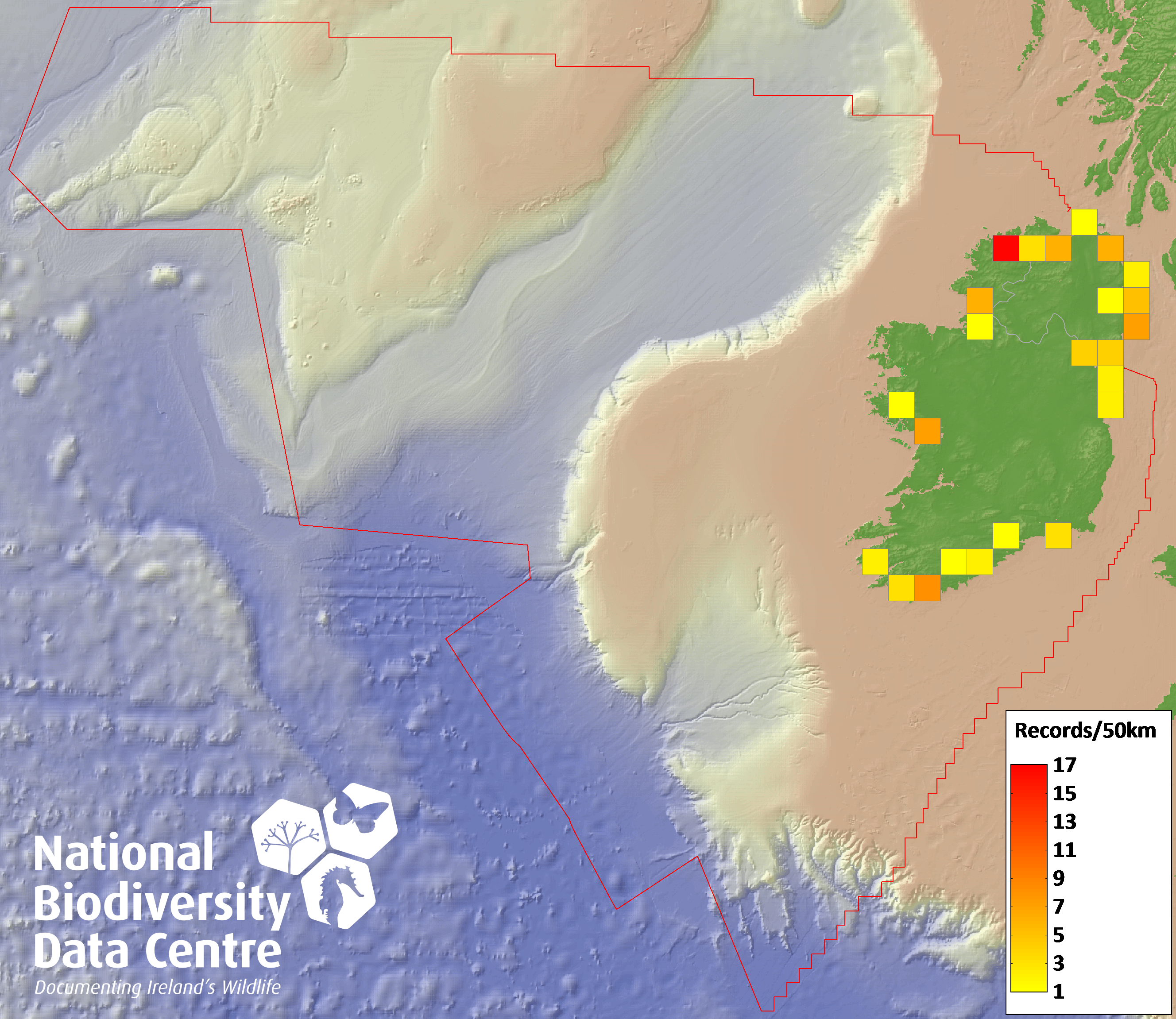 Distribution of the number of records recorded within each 10km grid square (ITM).Marine Map - 50km