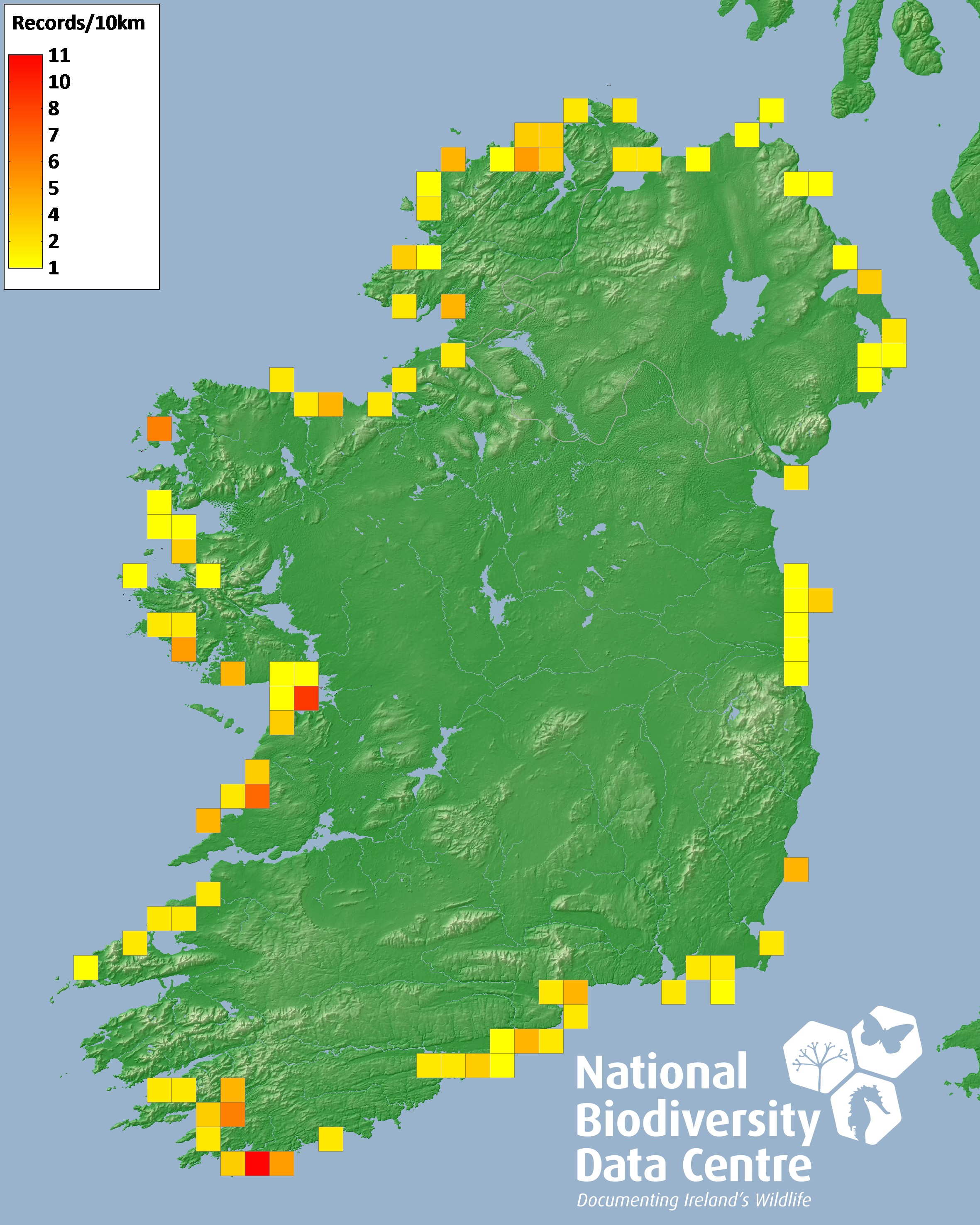 Distribution of the number of records recorded within each 10km grid square (ITM).Marine Map - 50km