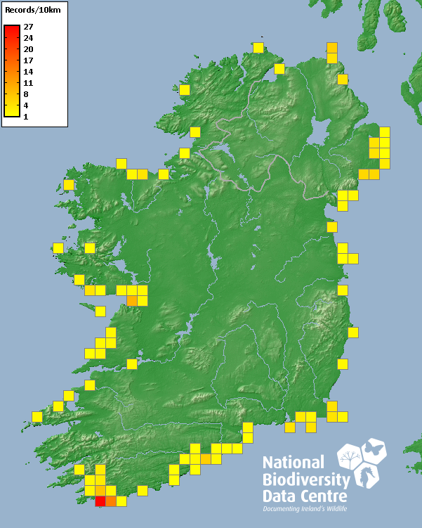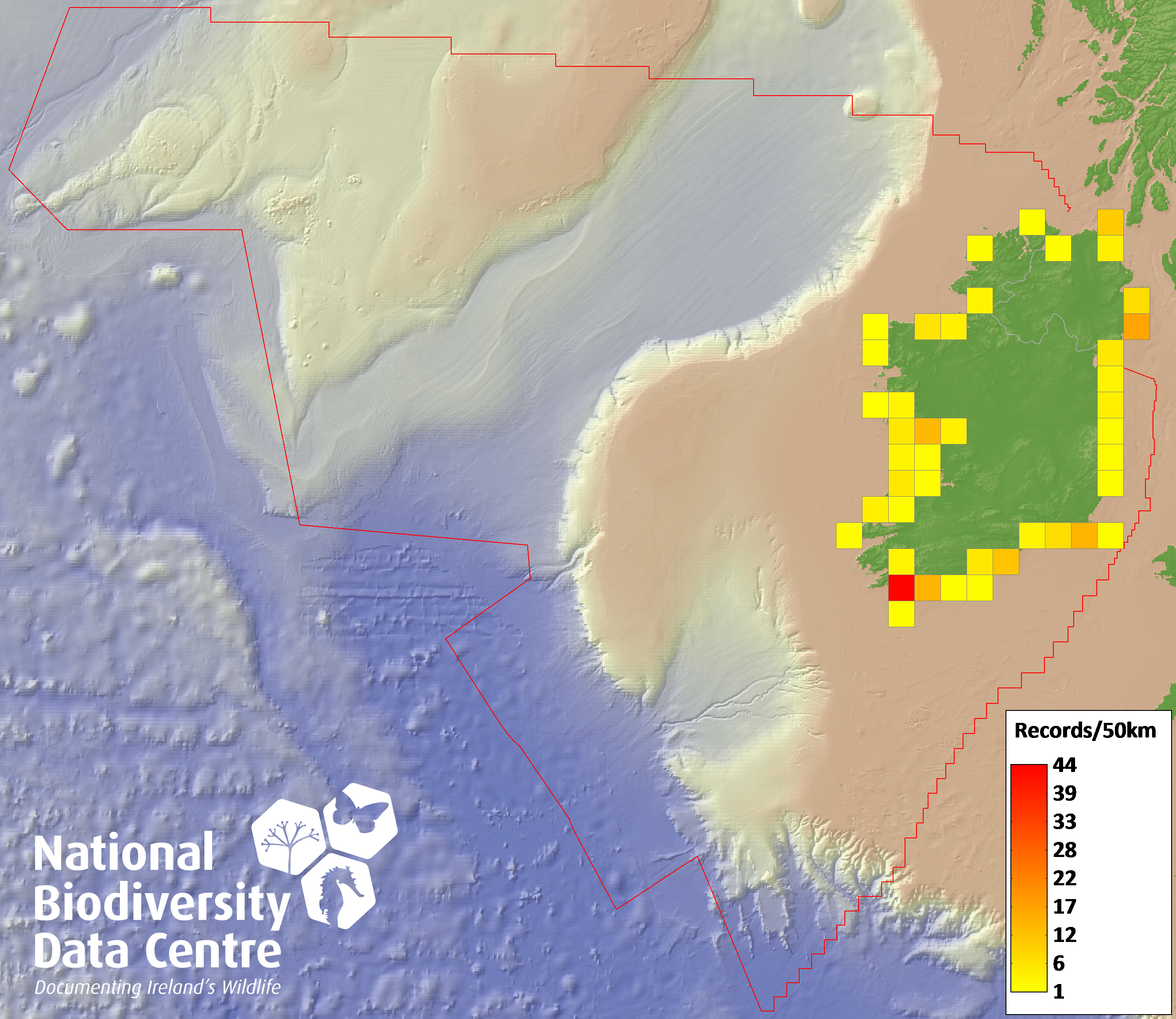 Distribution of the number of records recorded within each 10km grid square (ITM).Marine Map - 50km