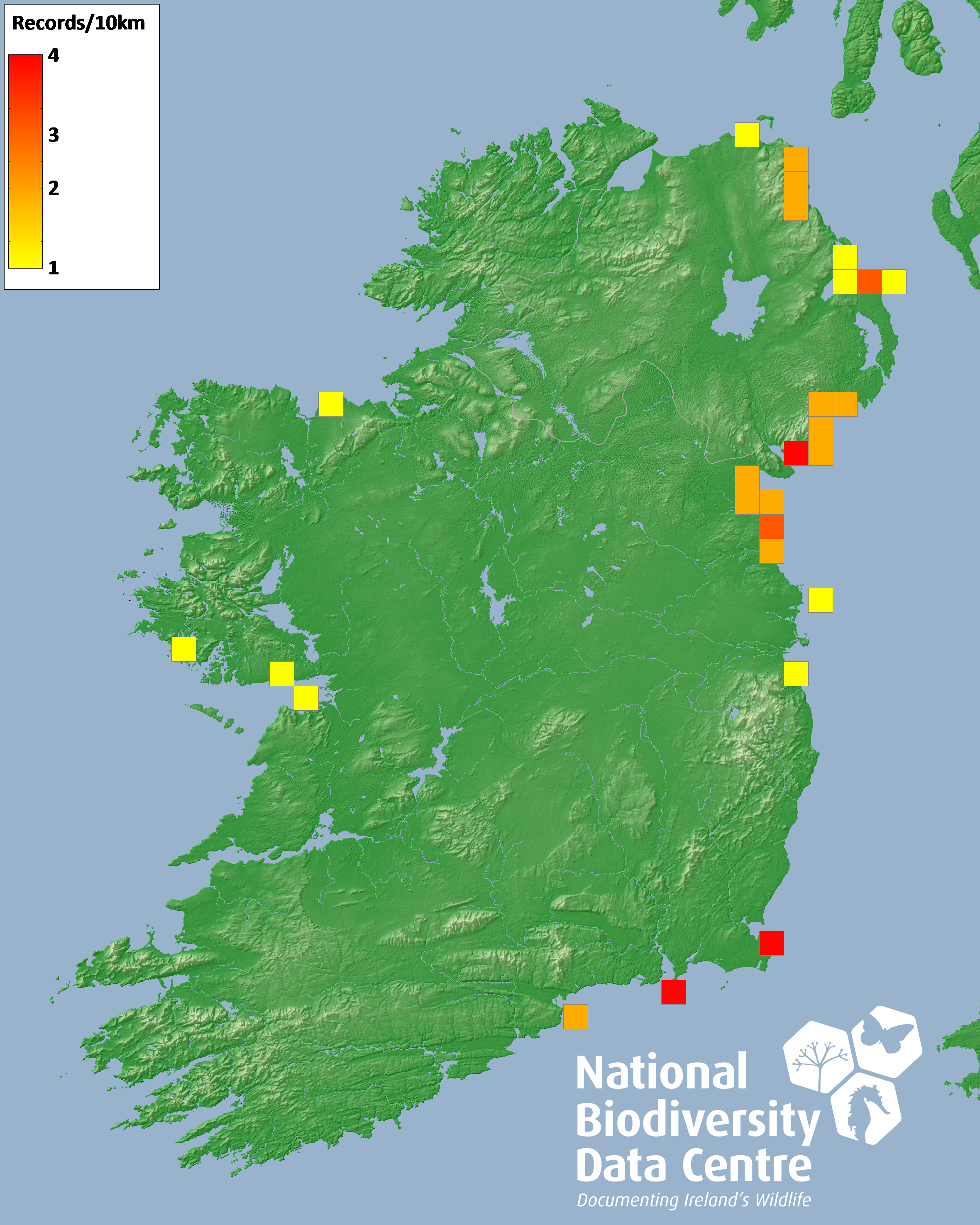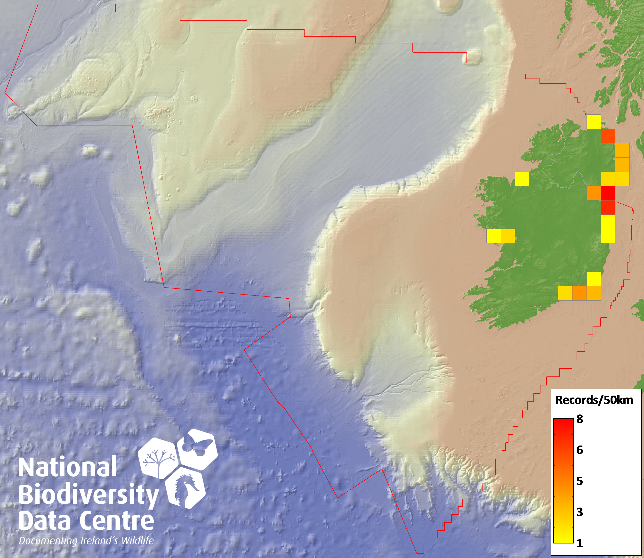 Distribution of the number of records recorded within each 10km grid square (ITM).Marine Map - 50km