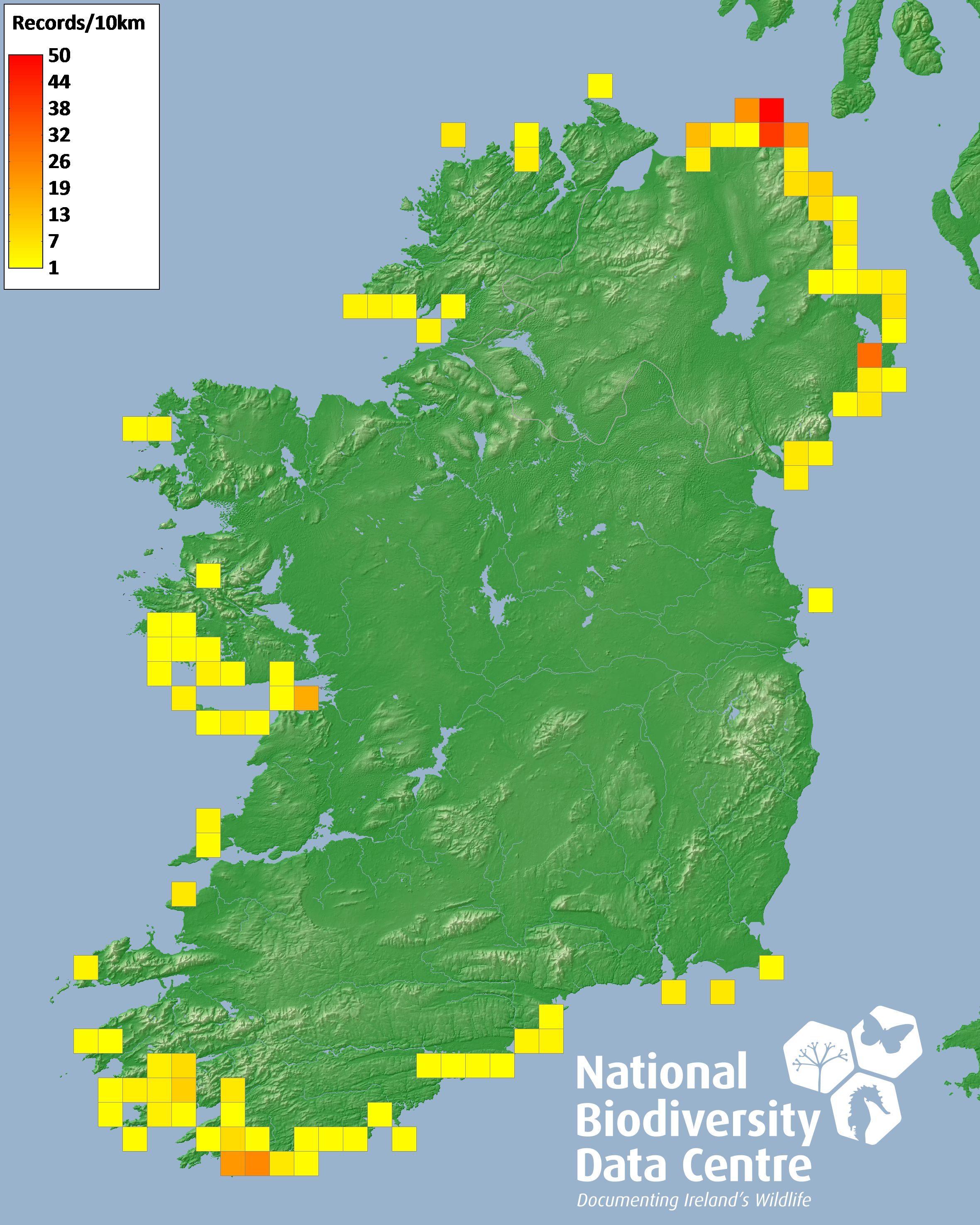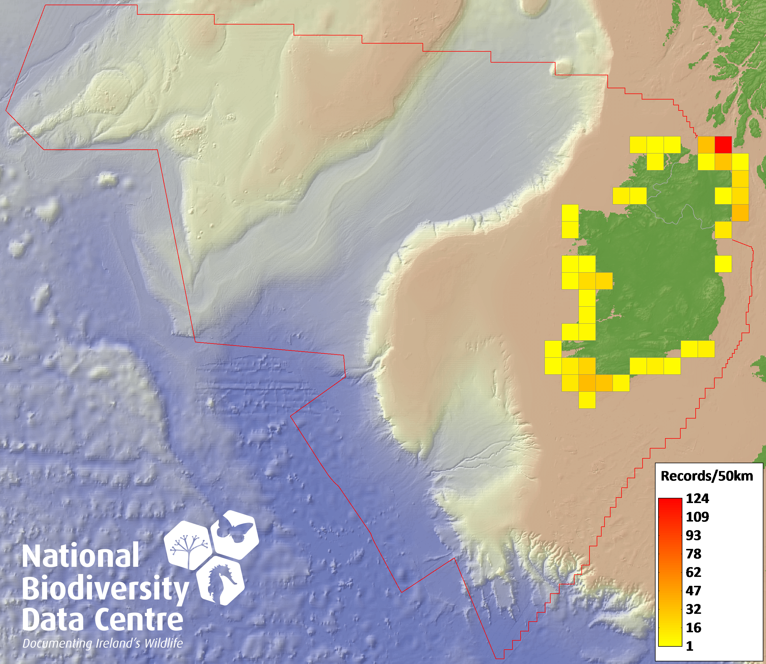 Distribution of the number of records recorded within each 10km grid square (ITM).Marine Map - 50km