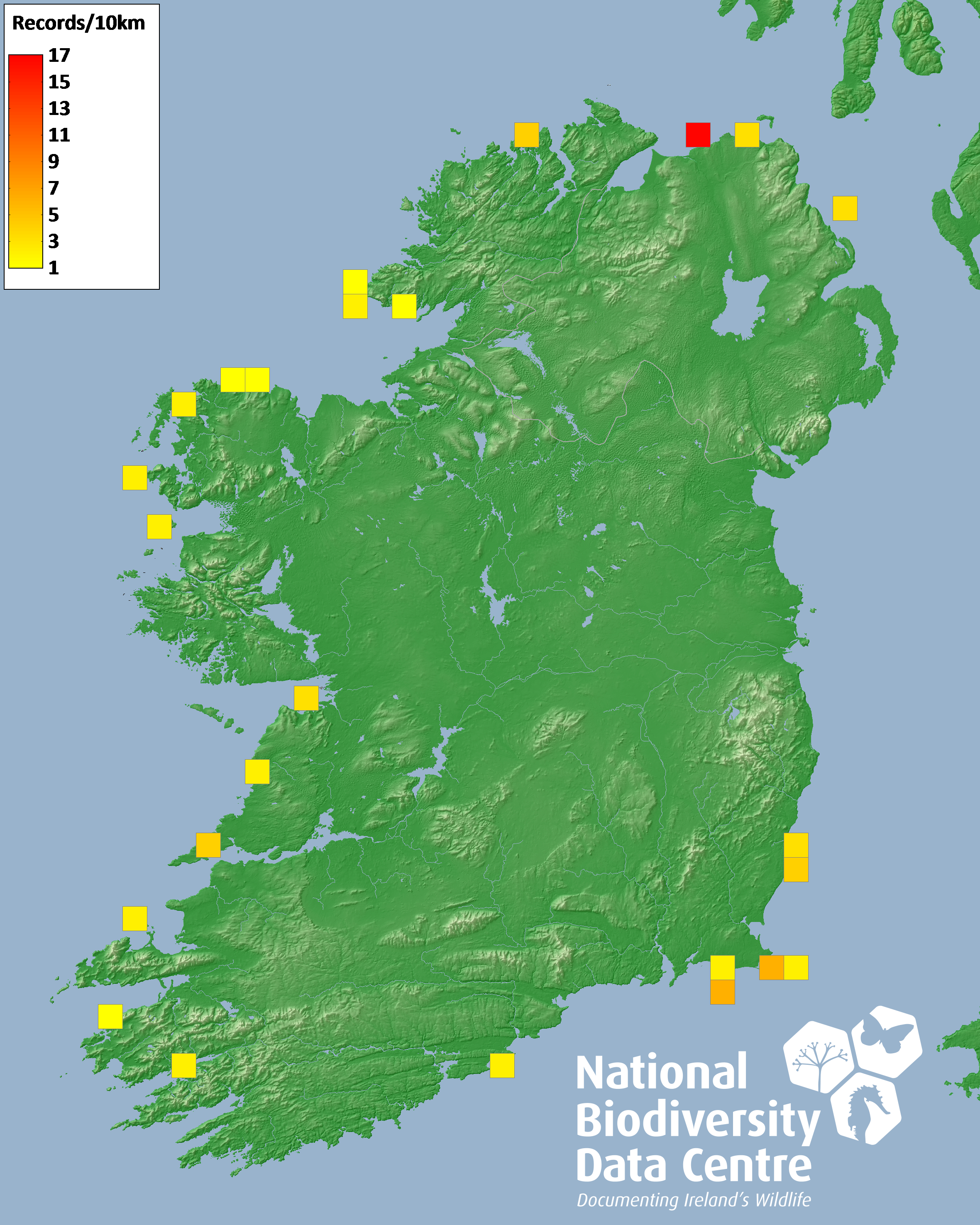Distribution of the number of records recorded within each 10km grid square (ITM).Marine Map - 50km