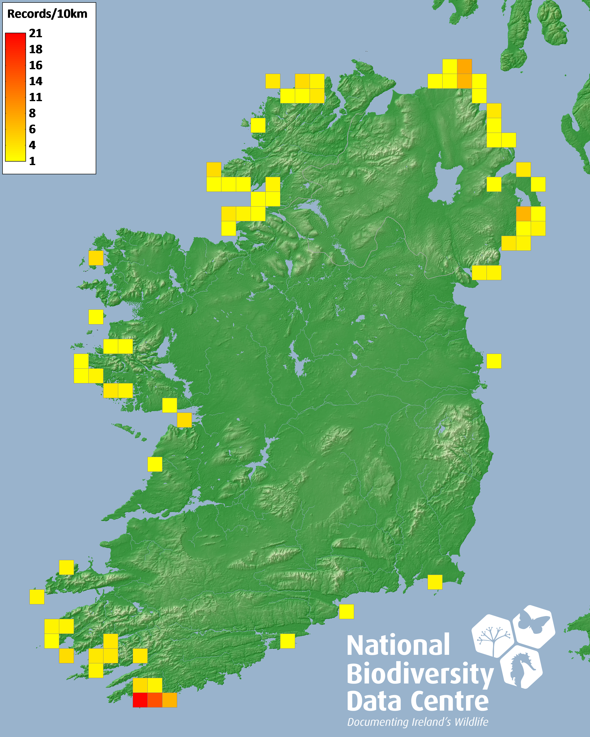 Distribution of the number of records recorded within each 10km grid square (ITM).Marine Map - 50km