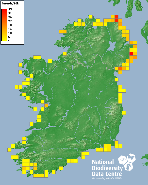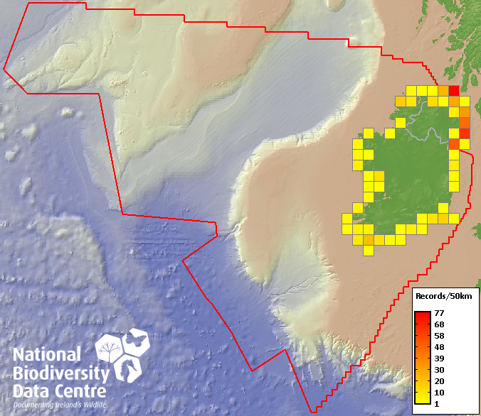Distribution of the number of records recorded within each 10km grid square (ITM).Marine Map - 50km
