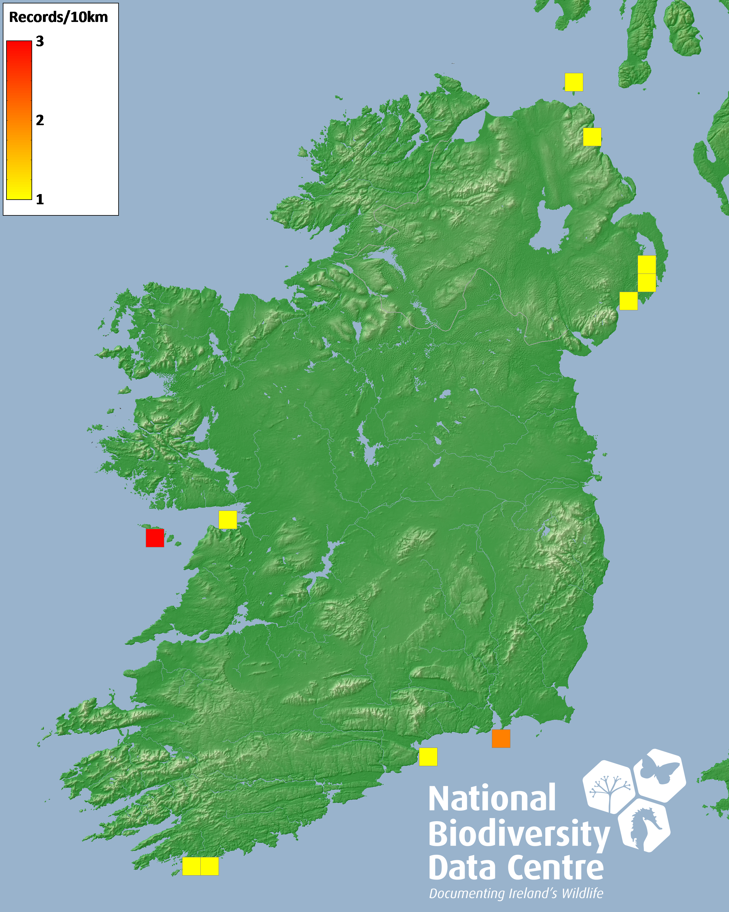 Distribution of the number of records recorded within each 10km grid square (ITM).Marine Map - 50km