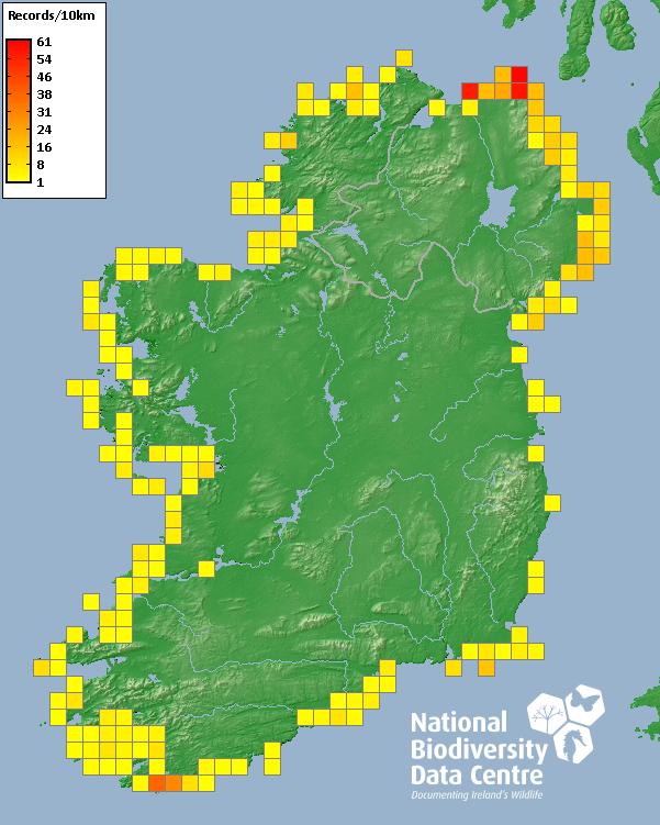 Distribution of the number of records recorded within each 10km grid square (ITM).Marine Map - 50km