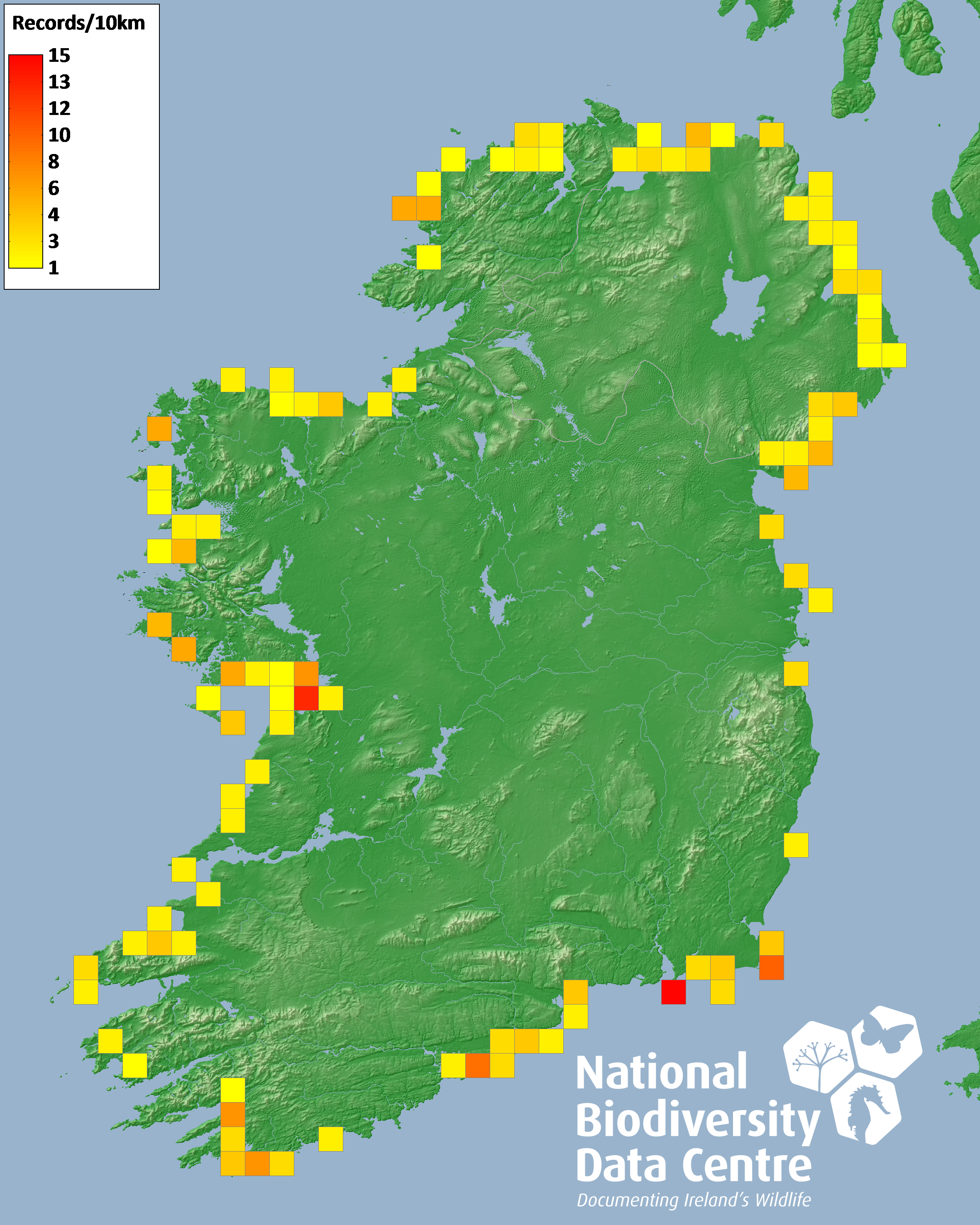 Distribution of the number of records recorded within each 10km grid square (ITM).Marine Map - 50km