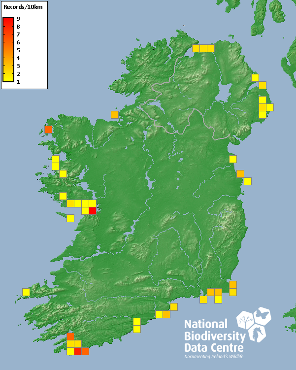 Distribution of the number of records recorded within each 10km grid square (ITM).Marine Map - 50km
