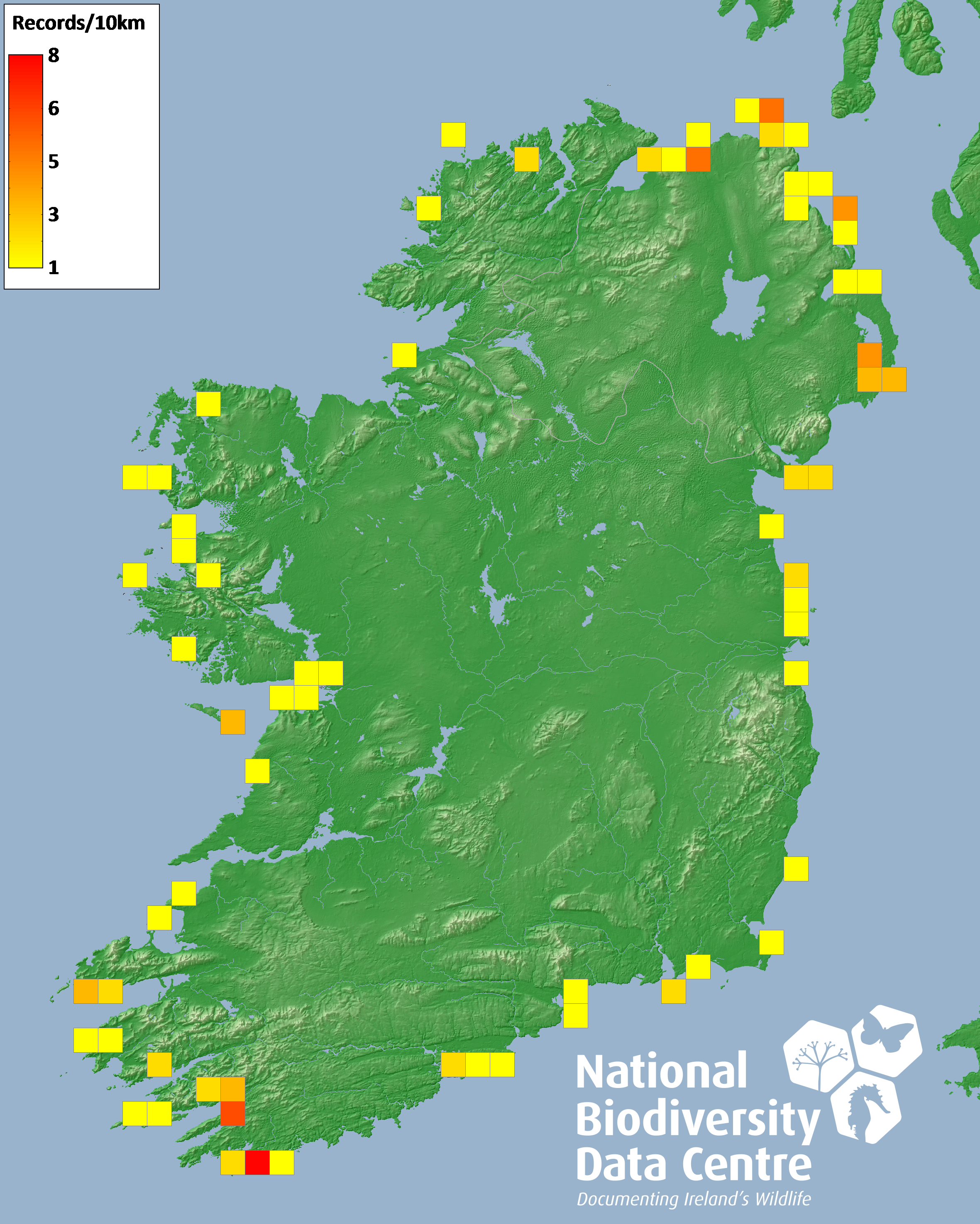 Distribution of the number of records recorded within each 10km grid square (ITM).Marine Map - 50km