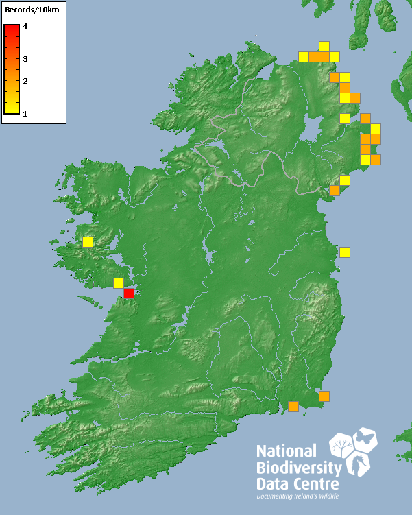 Distribution of the number of records recorded within each 10km grid square (ITM).Marine Map - 50km