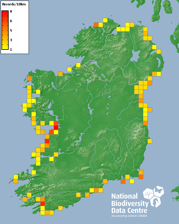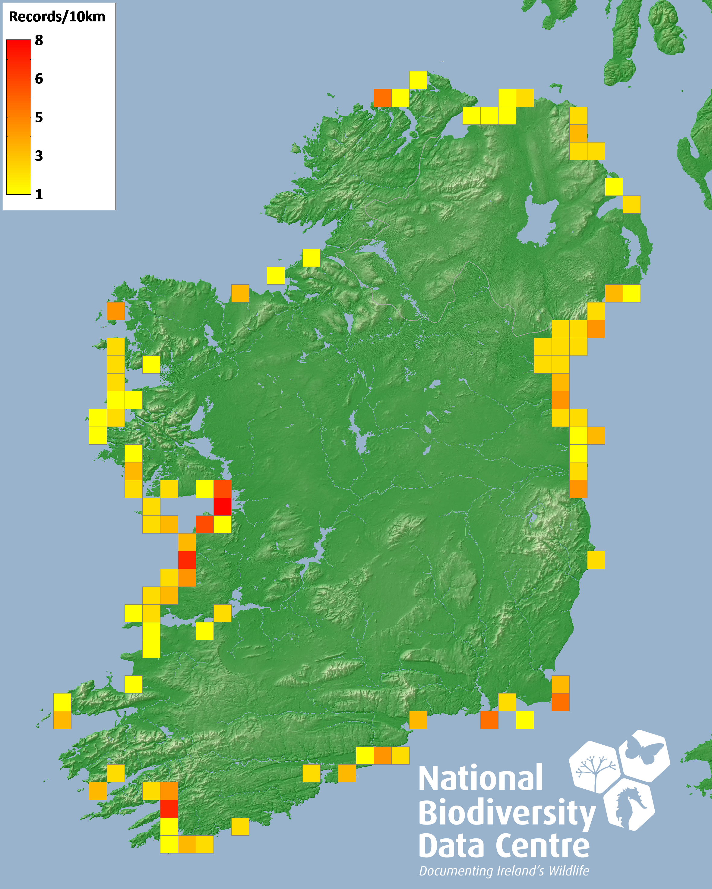Distribution of the number of records recorded within each 10km grid square (ITM).Marine Map - 50km