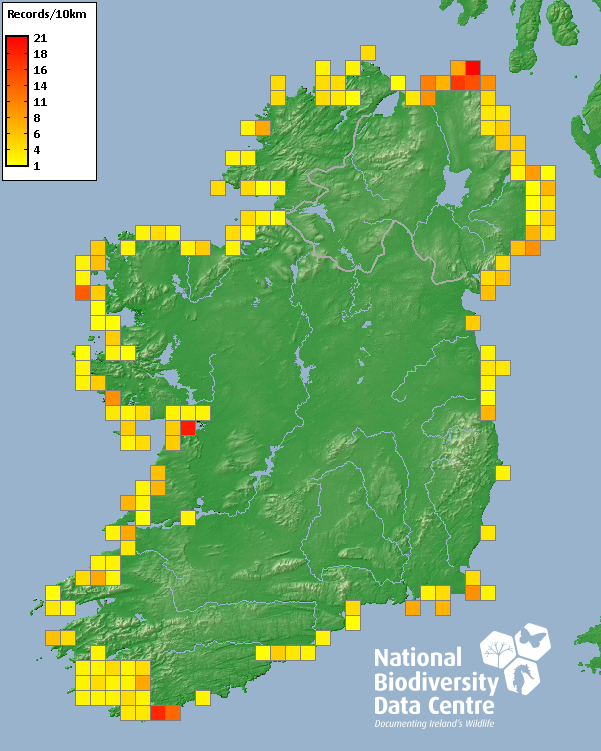 Distribution of the number of records recorded within each 10km grid square (ITM).Marine Map - 50km
