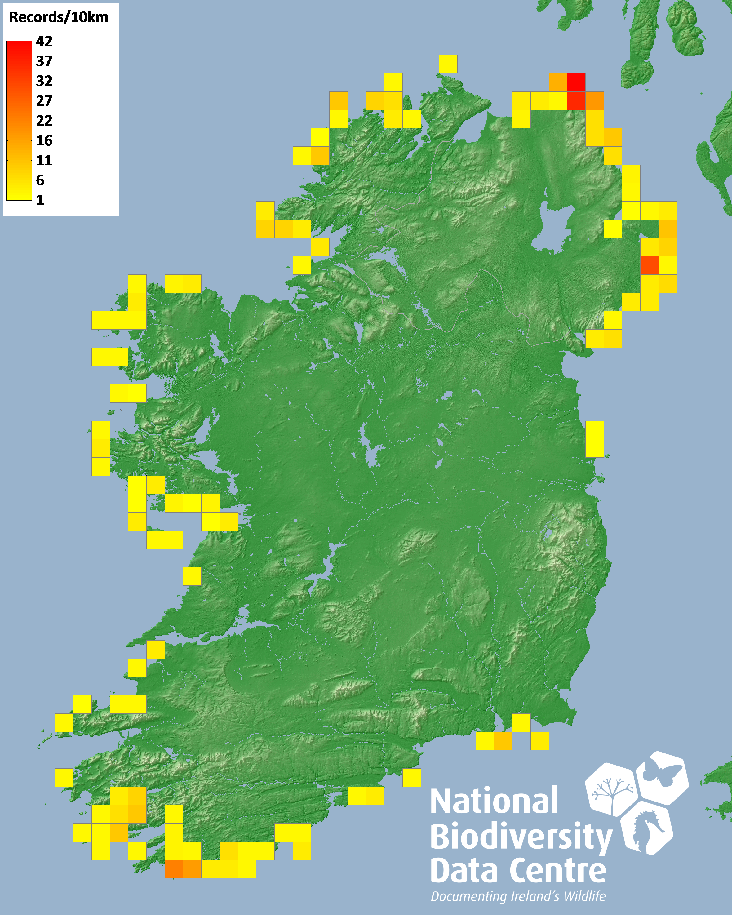 Distribution of the number of records recorded within each 10km grid square (ITM).Marine Map - 50km
