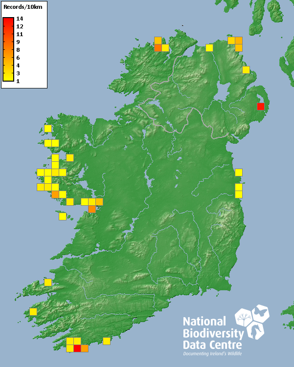 Distribution of the number of records recorded within each 10km grid square (ITM).Marine Map - 50km