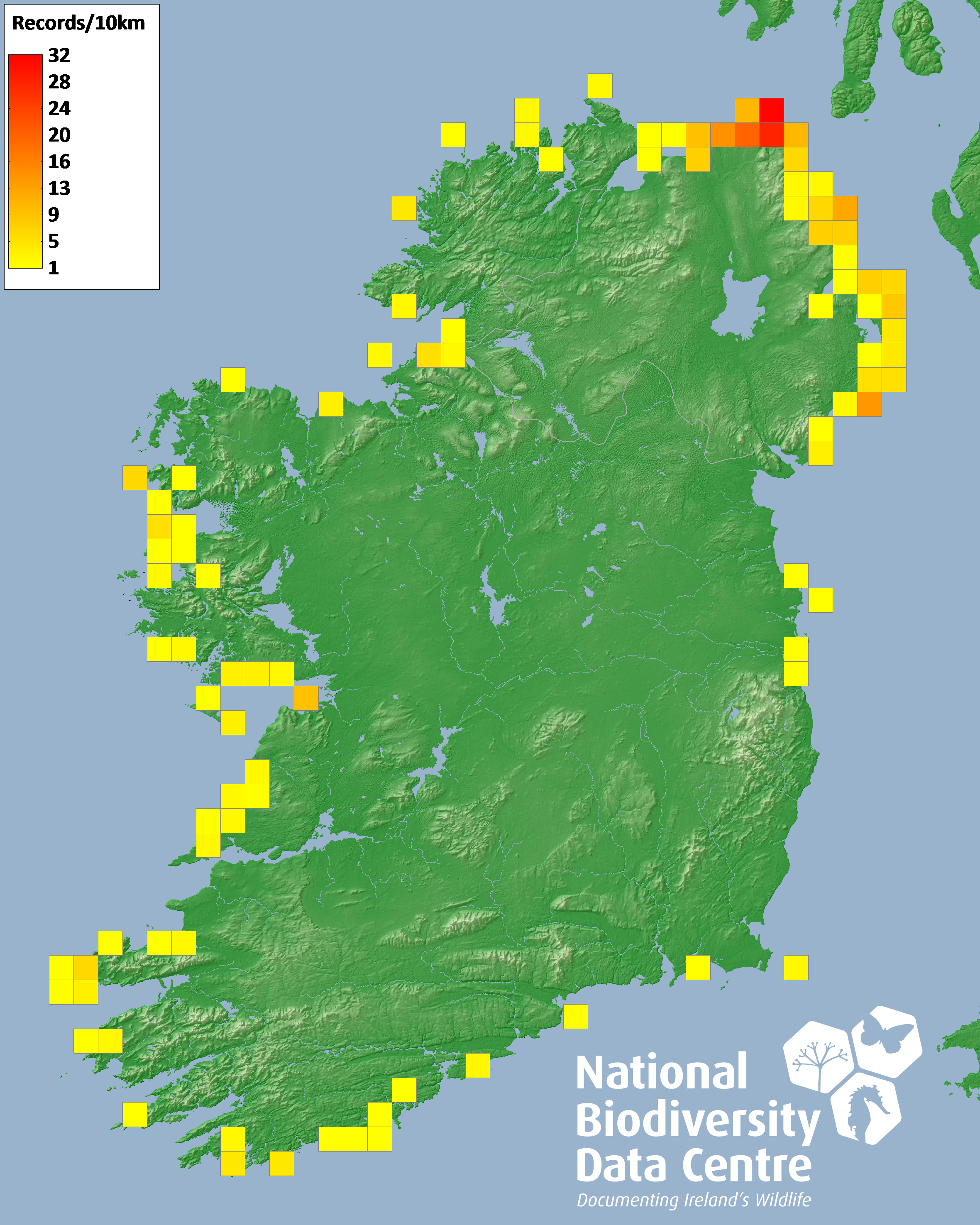 Distribution of the number of records recorded within each 10km grid square (ITM).Marine Map - 50km