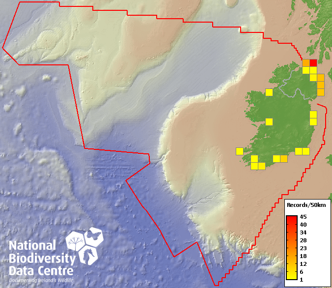 Distribution of the number of records recorded within each 10km grid square (ITM).Marine Map - 50km