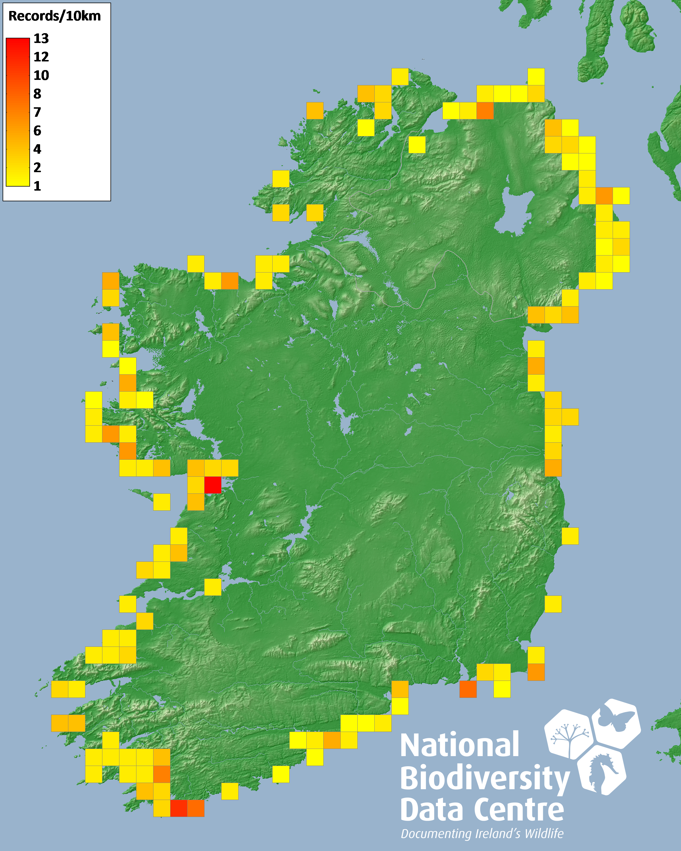 Distribution of the number of records recorded within each 10km grid square (ITM).Marine Map - 50km