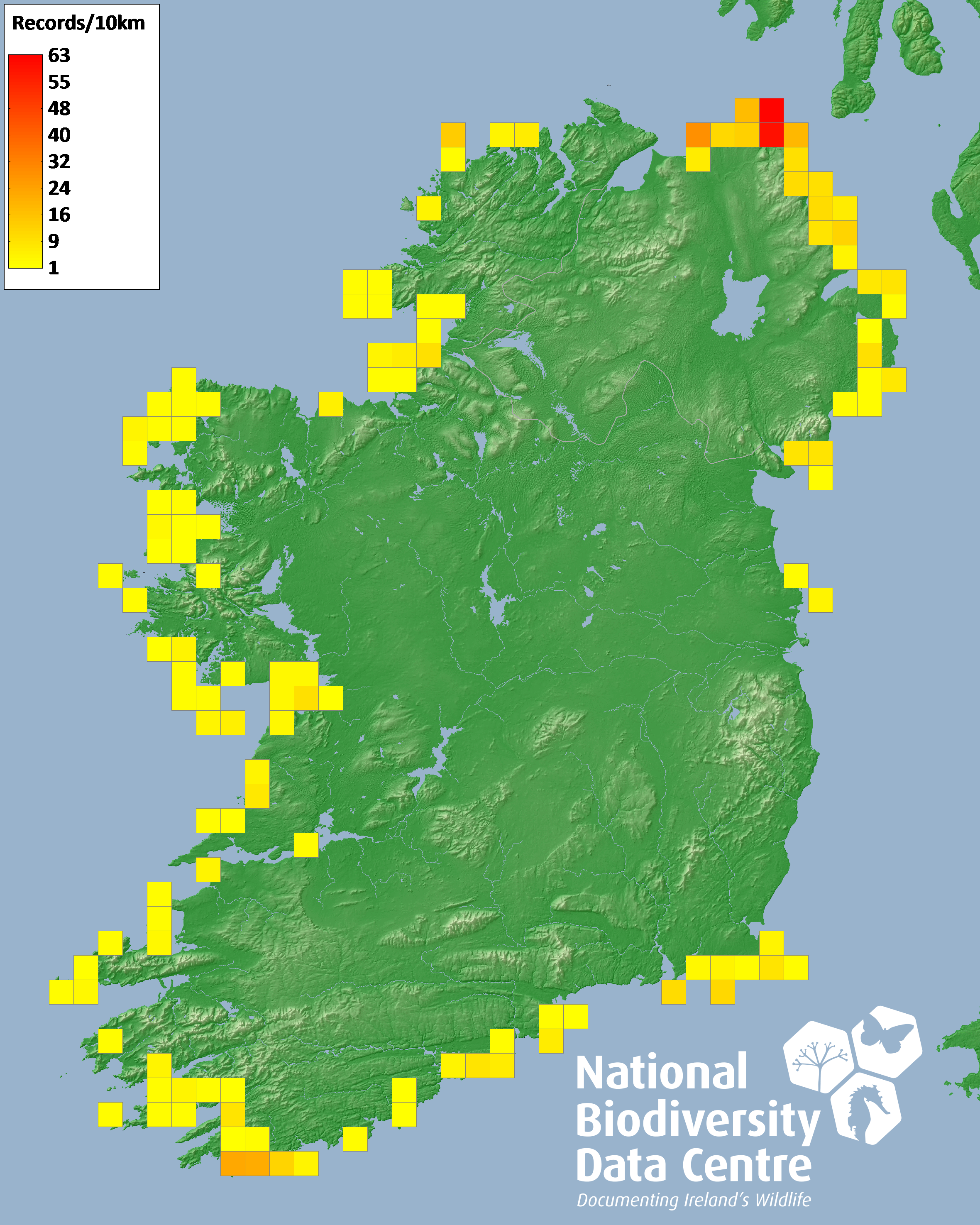 Distribution of the number of records recorded within each 10km grid square (ITM).Marine Map - 50km