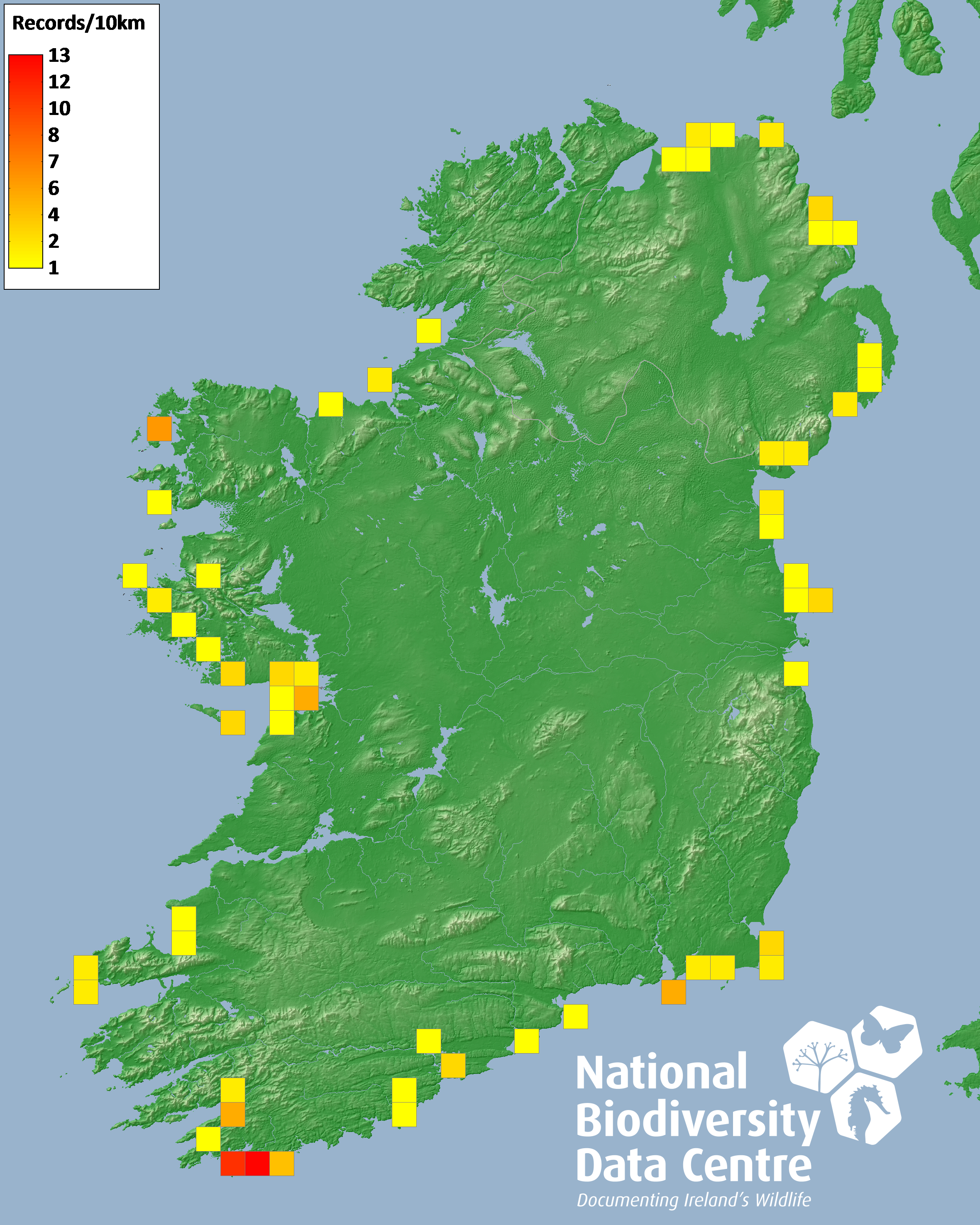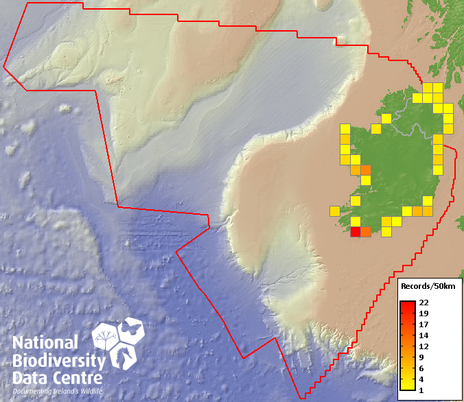 Distribution of the number of records recorded within each 10km grid square (ITM).Marine Map - 50km