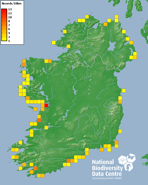 Distribution of the number of records recorded within each 10km grid square (ITM).Marine Map - 50km