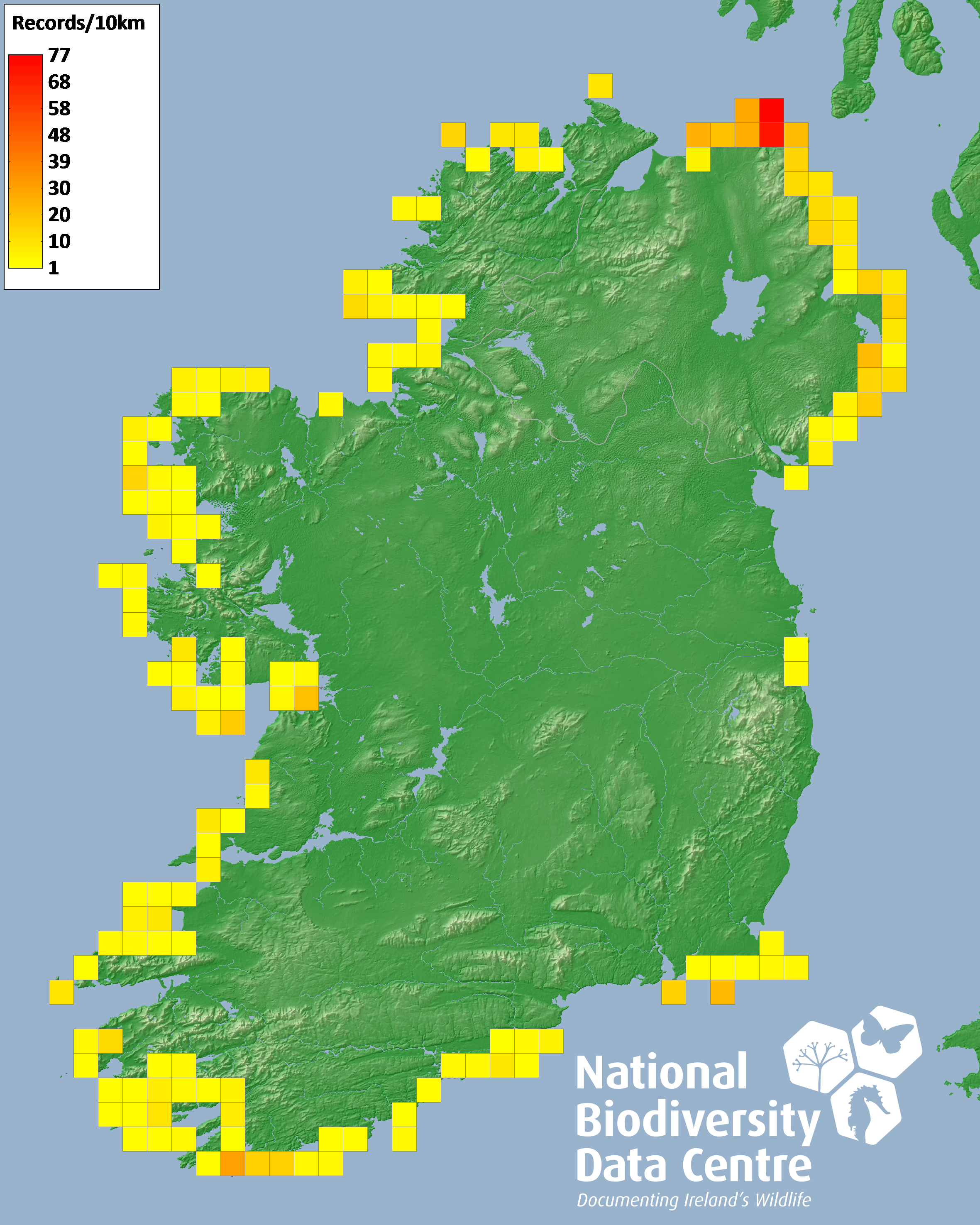 Distribution of the number of records recorded within each 10km grid square (ITM).Marine Map - 50km