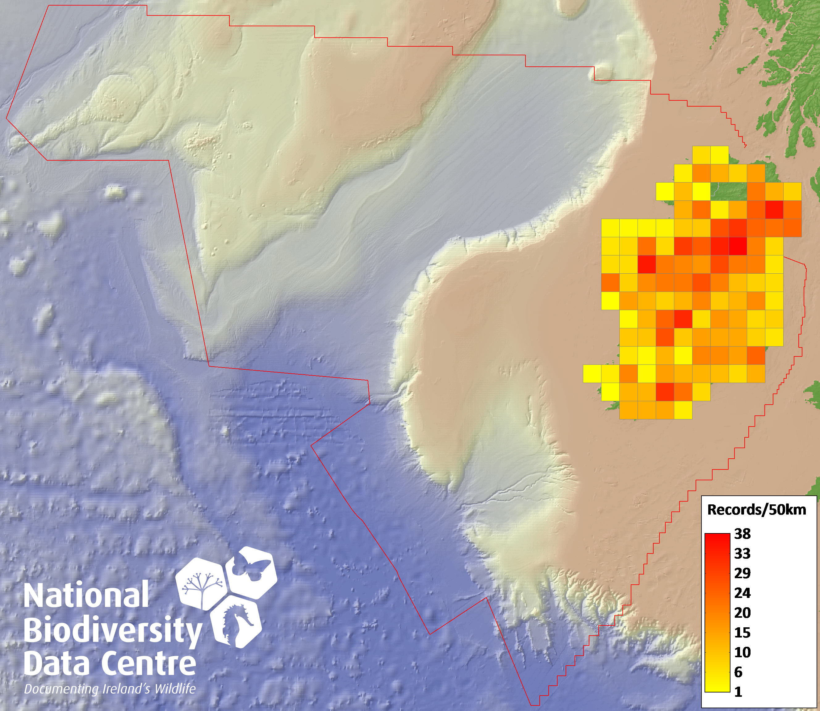 Distribution of the number of records recorded within each 10km grid square (ITM).Marine Map - 50km