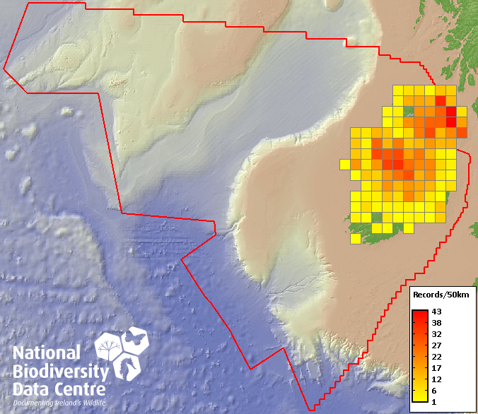 Distribution of the number of records recorded within each 10km grid square (ITM).Marine Map - 50km
