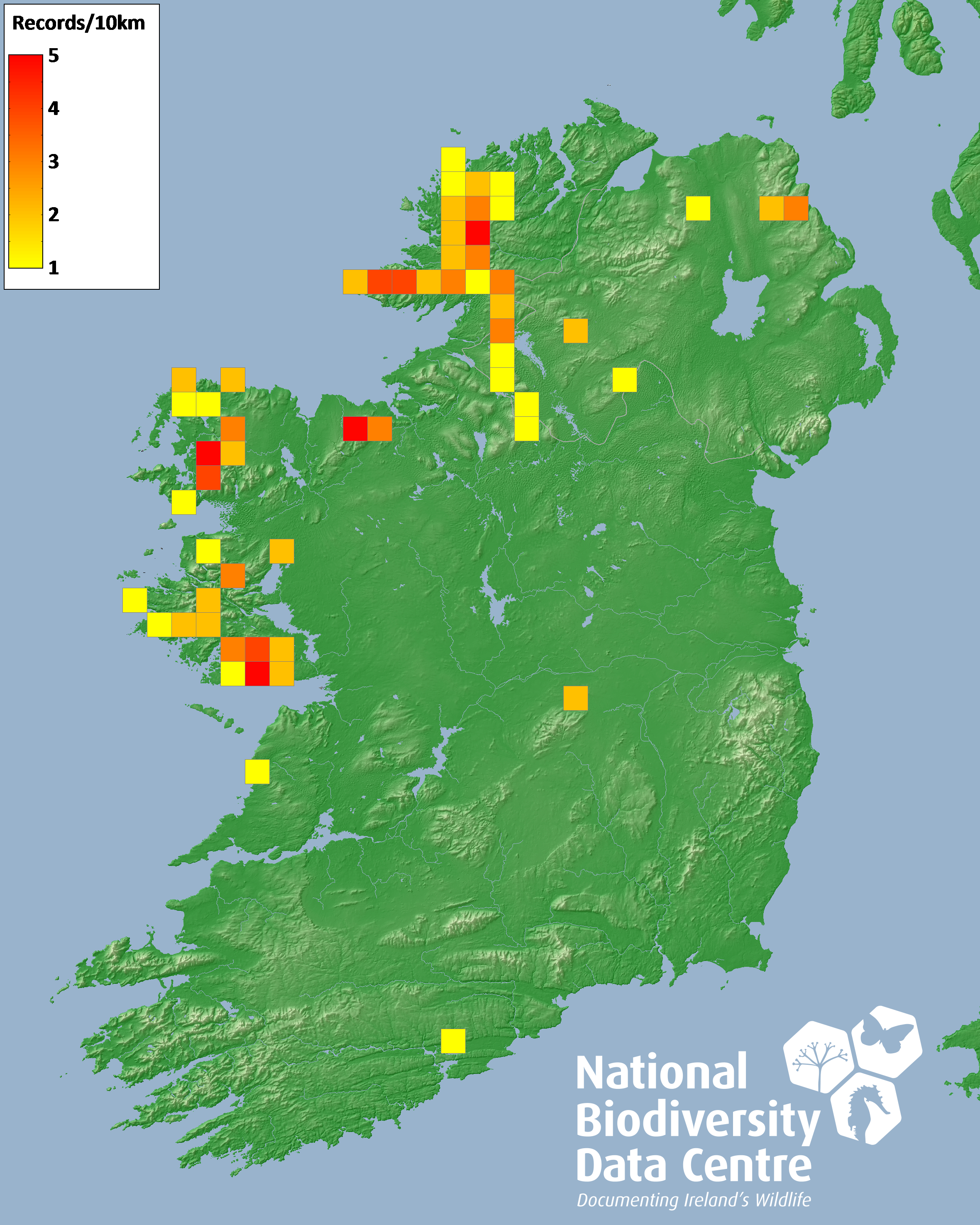 Distribution of the number of records recorded within each 10km grid square (ITM).Marine Map - 50km