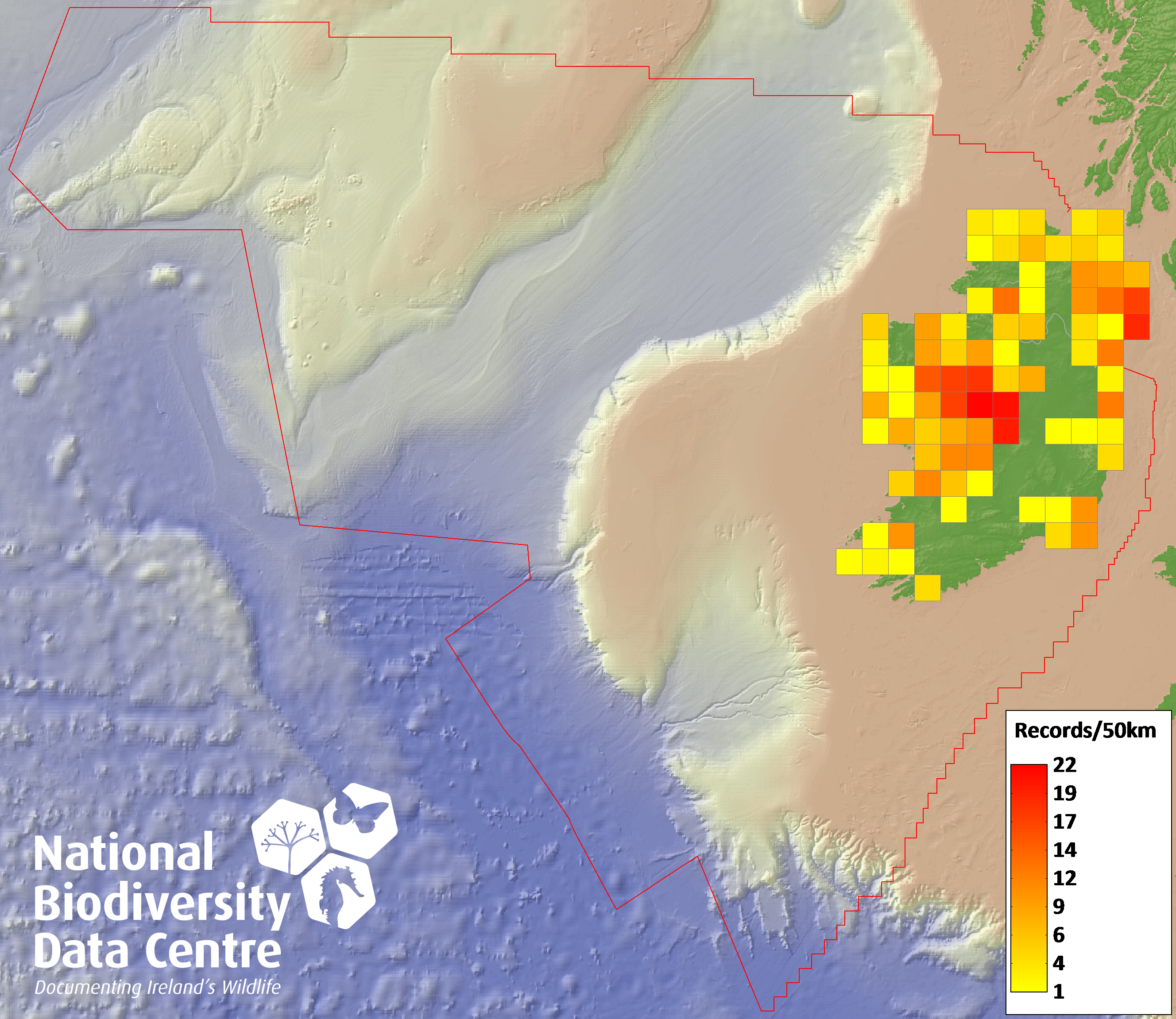 Distribution of the number of records recorded within each 10km grid square (ITM).Marine Map - 50km
