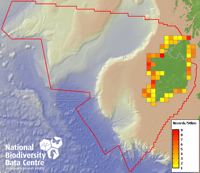 Distribution of the number of records recorded within each 10km grid square (ITM).Marine Map - 50km