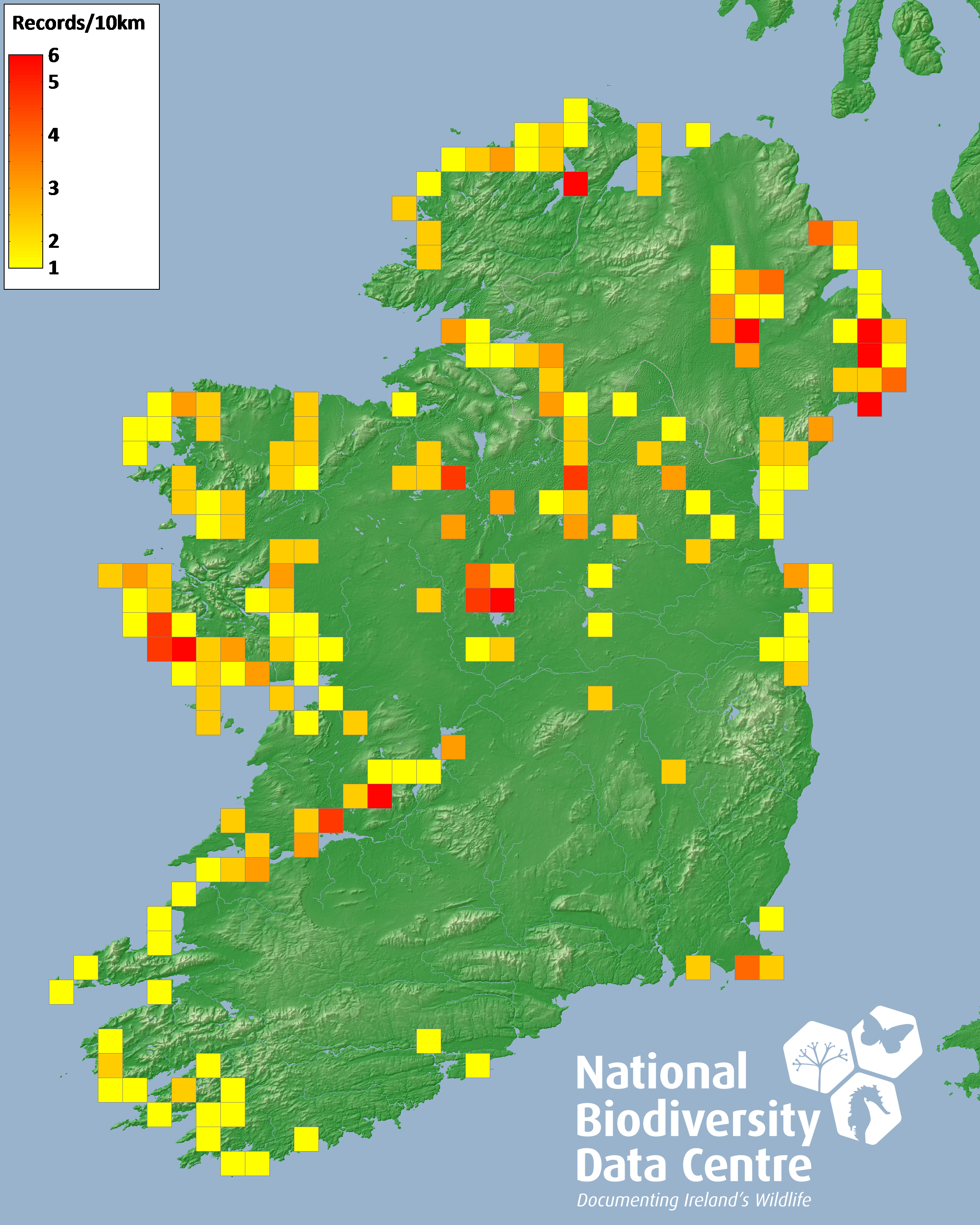 Distribution of the number of records recorded within each 10km grid square (ITM).Marine Map - 50km