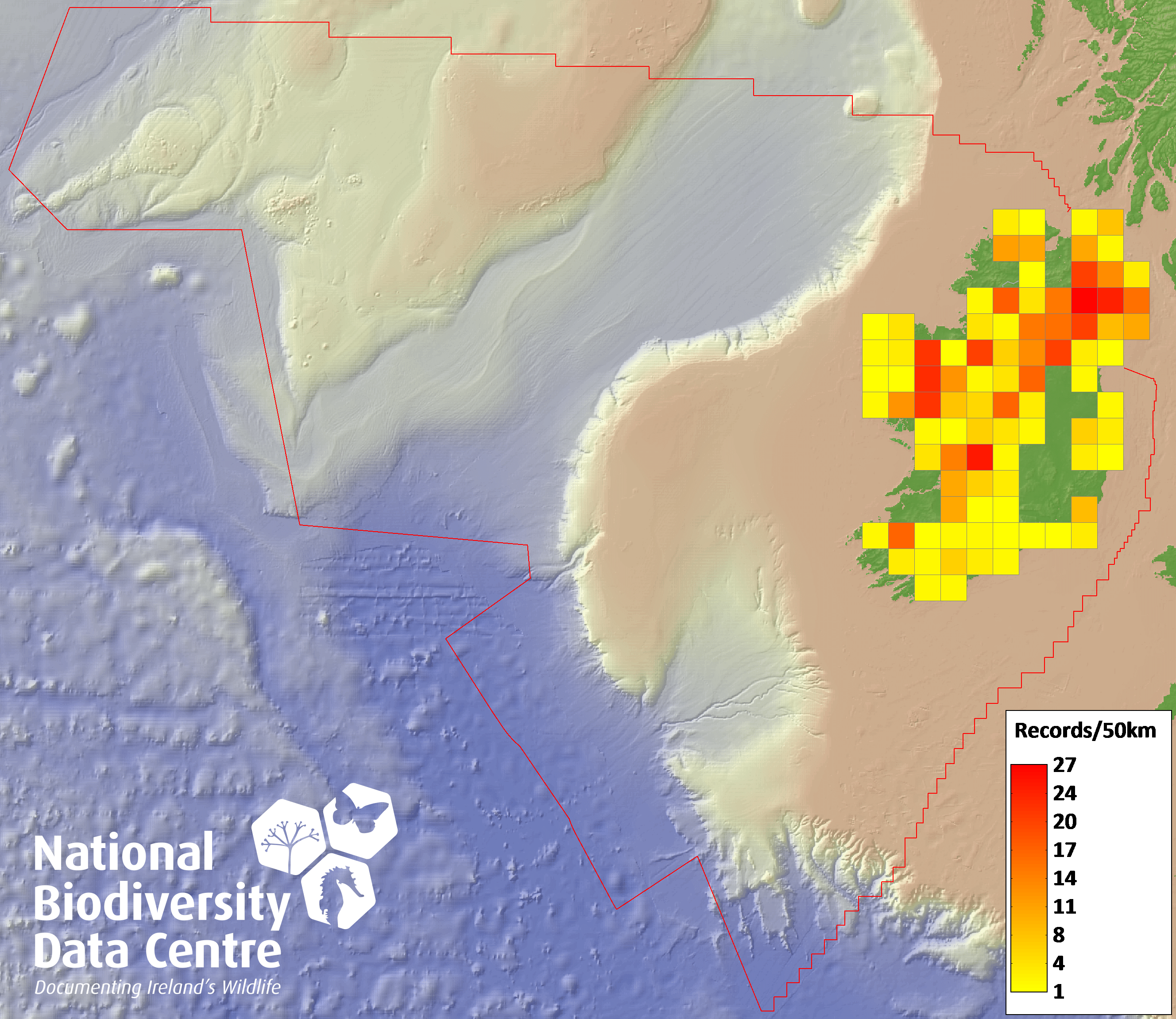 Distribution of the number of records recorded within each 10km grid square (ITM).Marine Map - 50km