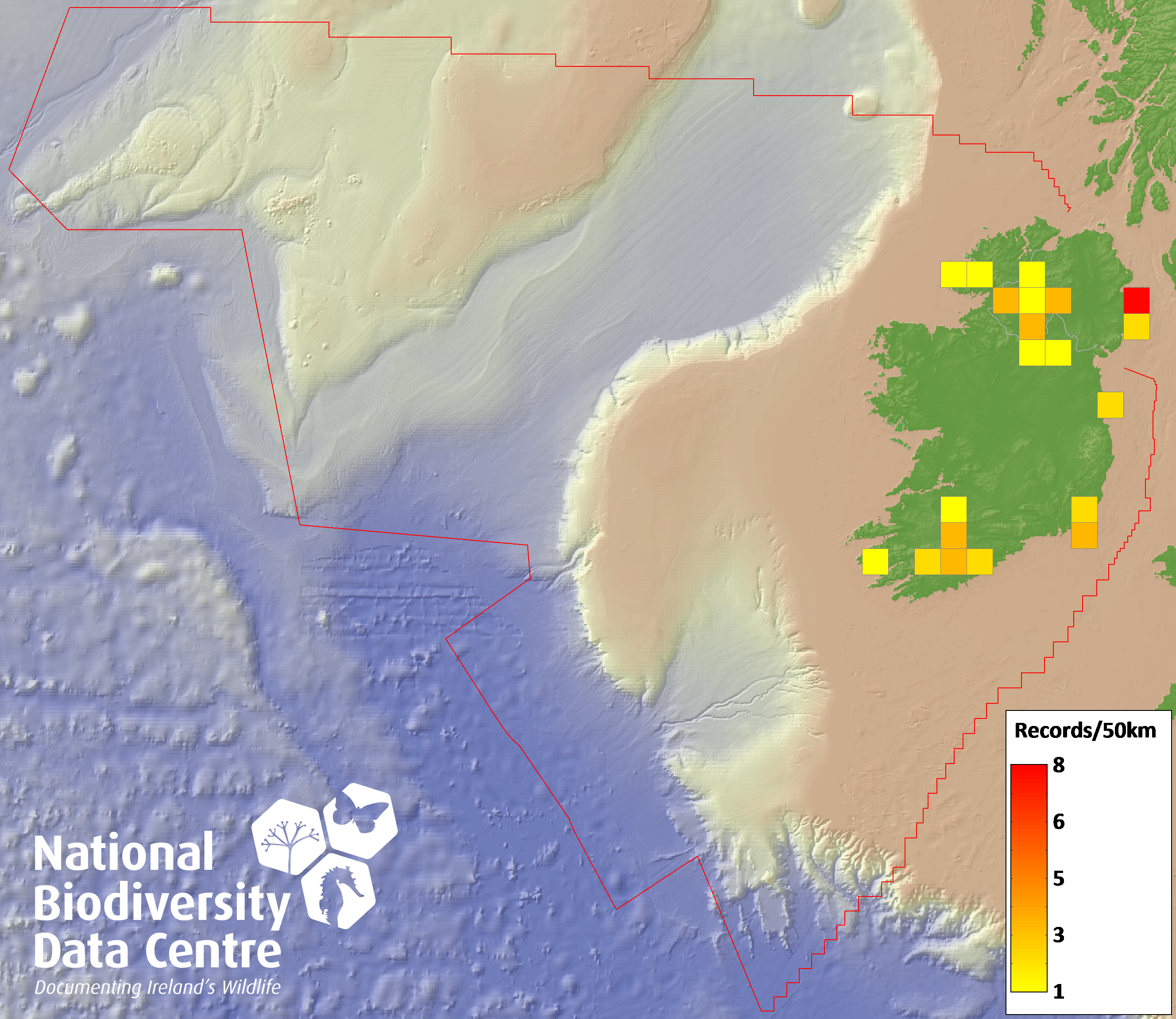 Distribution of the number of records recorded within each 10km grid square (ITM).Marine Map - 50km