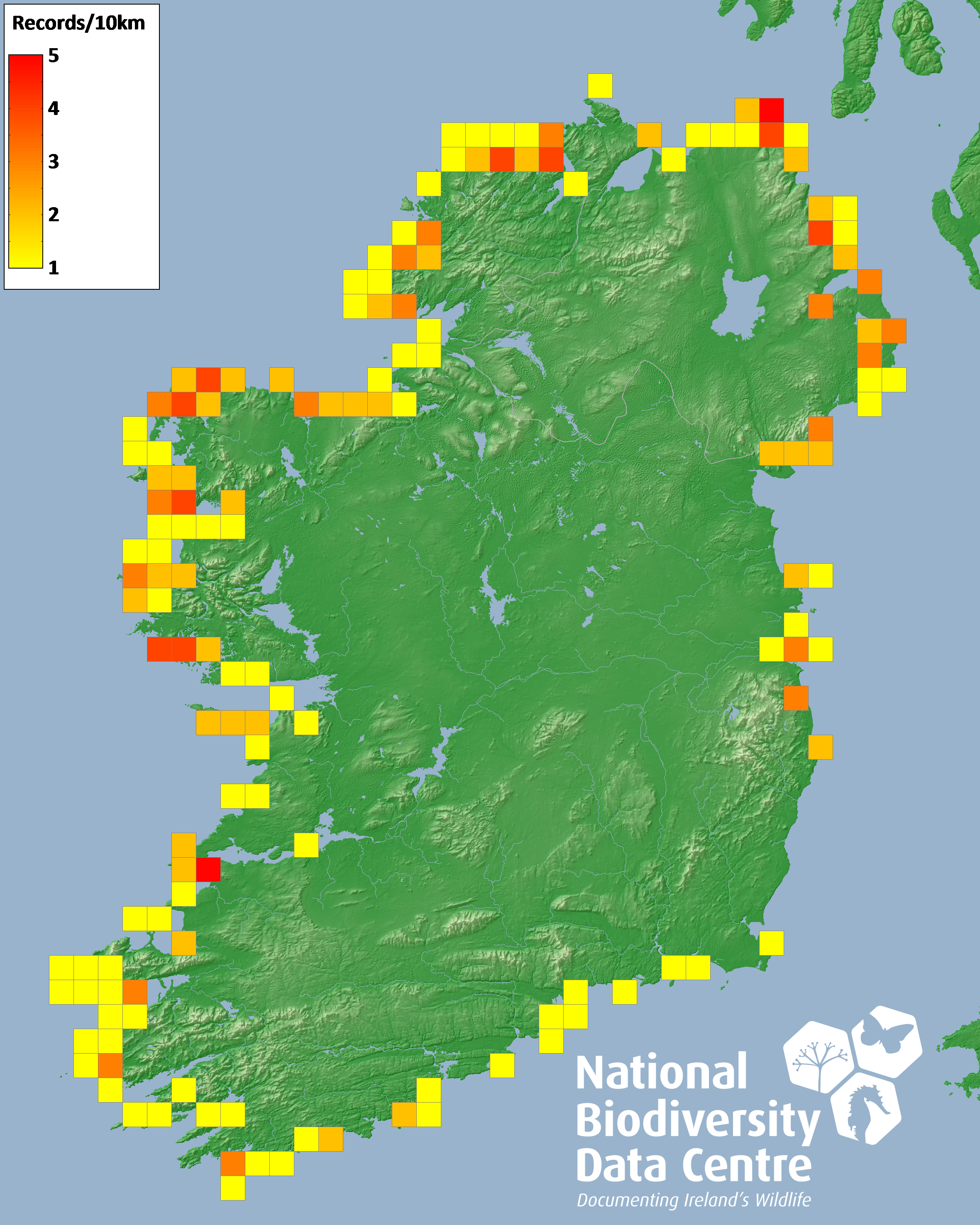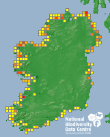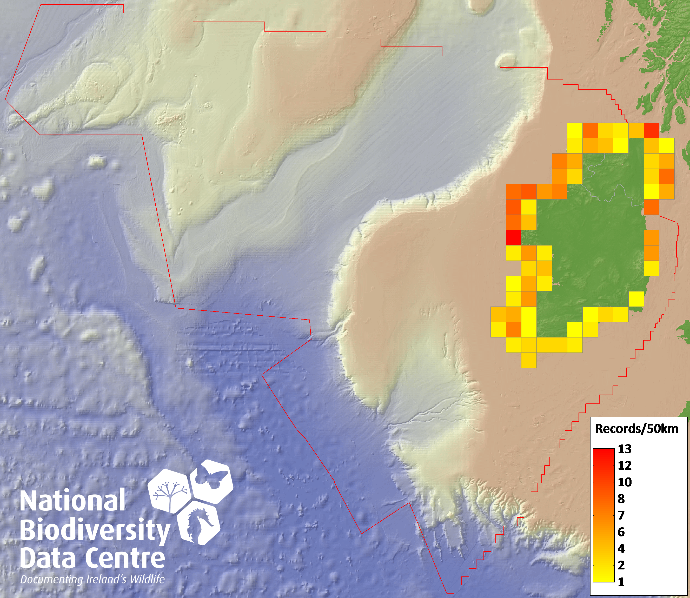 Distribution of the number of records recorded within each 10km grid square (ITM).Marine Map - 50km