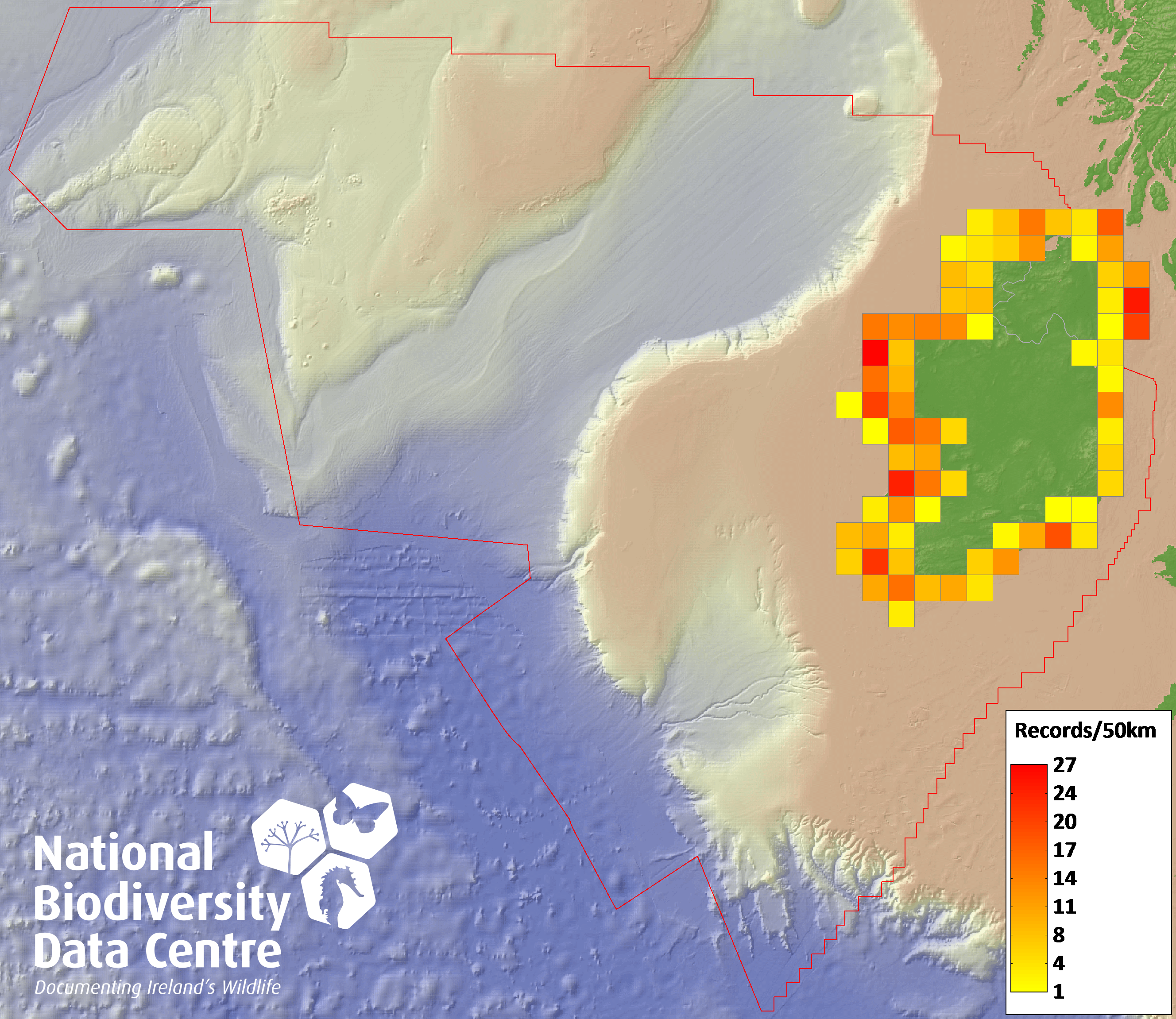 Distribution of the number of records recorded within each 10km grid square (ITM).Marine Map - 50km