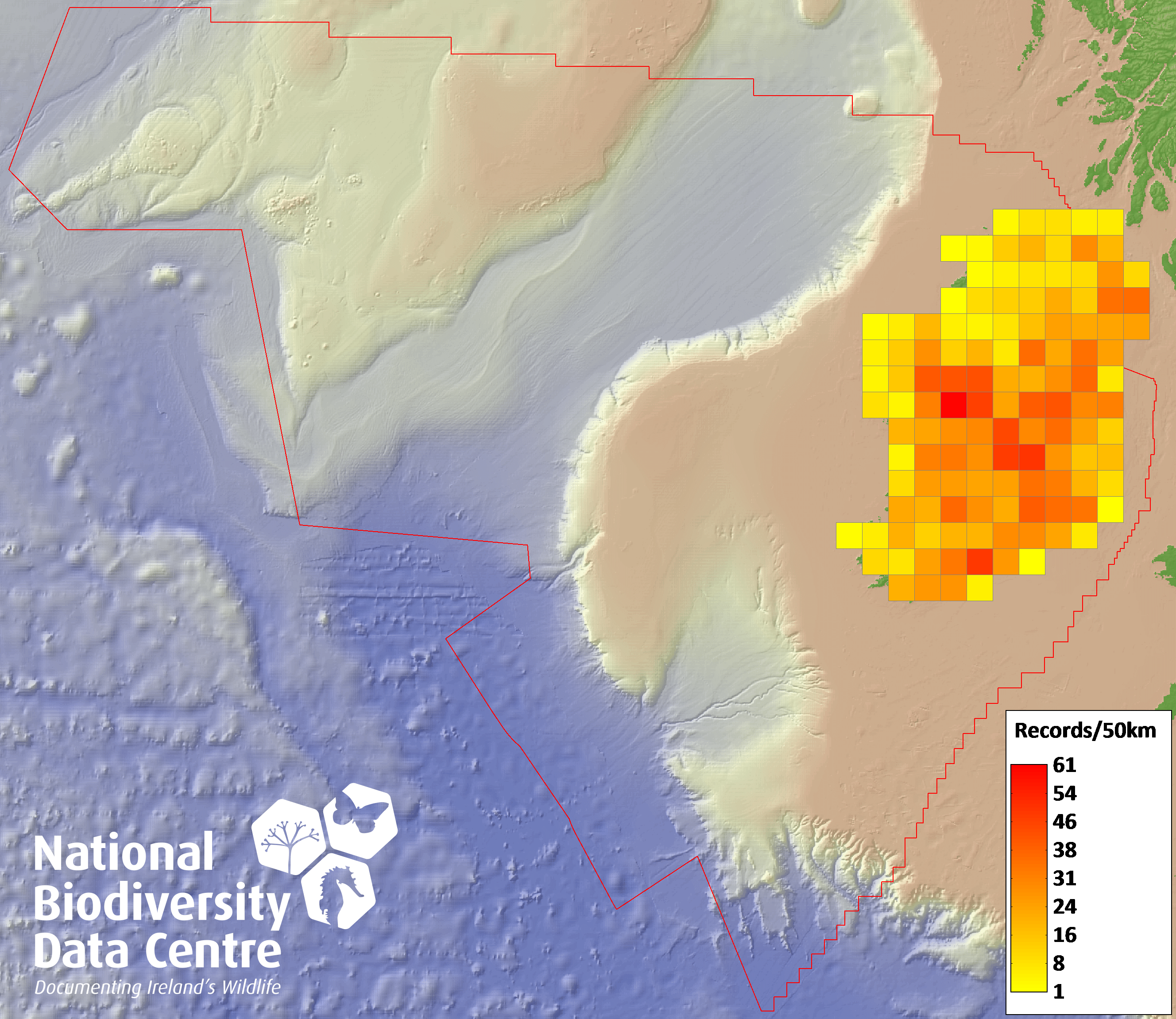 Distribution of the number of records recorded within each 10km grid square (ITM).Marine Map - 50km