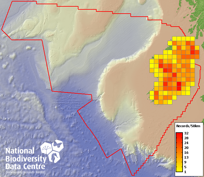 Distribution of the number of records recorded within each 10km grid square (ITM).Marine Map - 50km