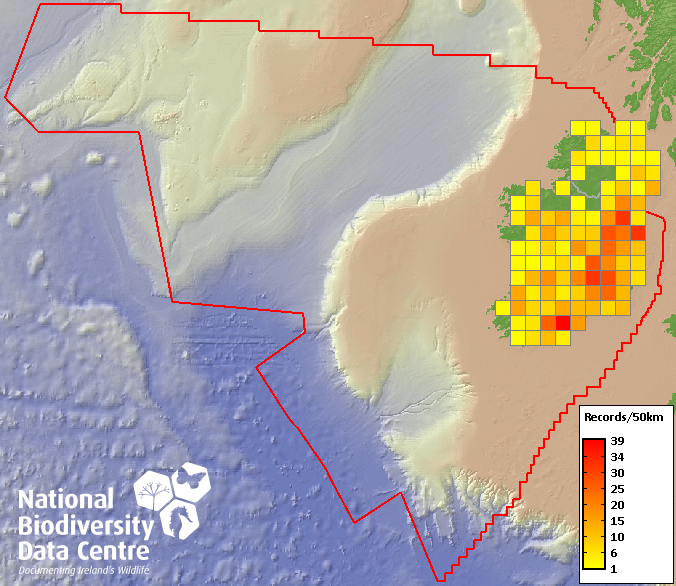 Distribution of the number of records recorded within each 10km grid square (ITM).Marine Map - 50km