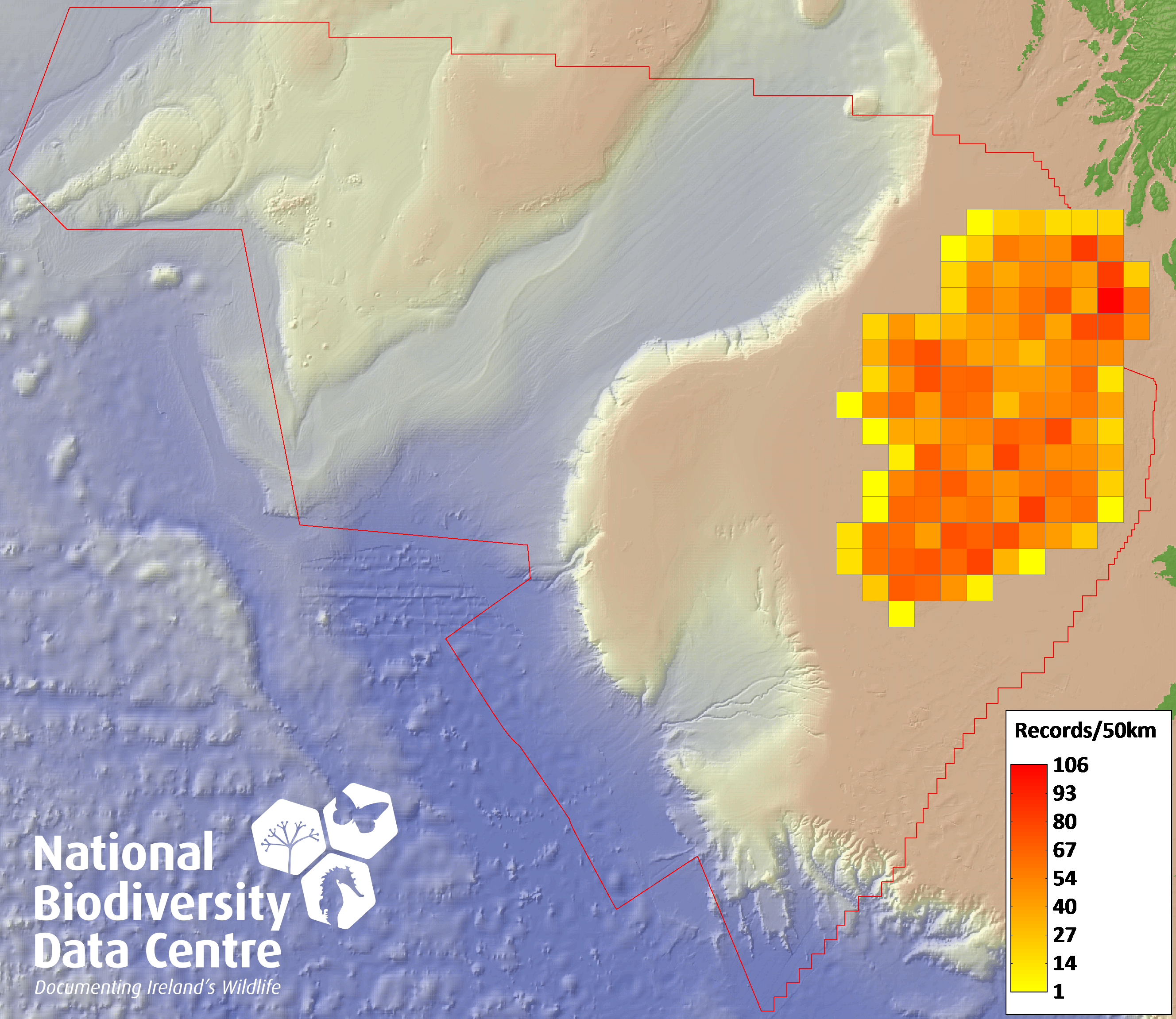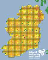 Distribution of the number of records recorded within each 10km grid square (ITM).Marine Map - 50km