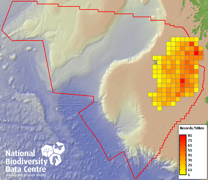 Distribution of the number of records recorded within each 10km grid square (ITM).Marine Map - 50km