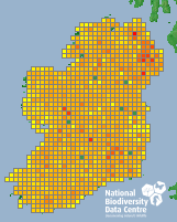 Distribution of the number of records recorded within each 10km grid square (ITM).Marine Map - 50km