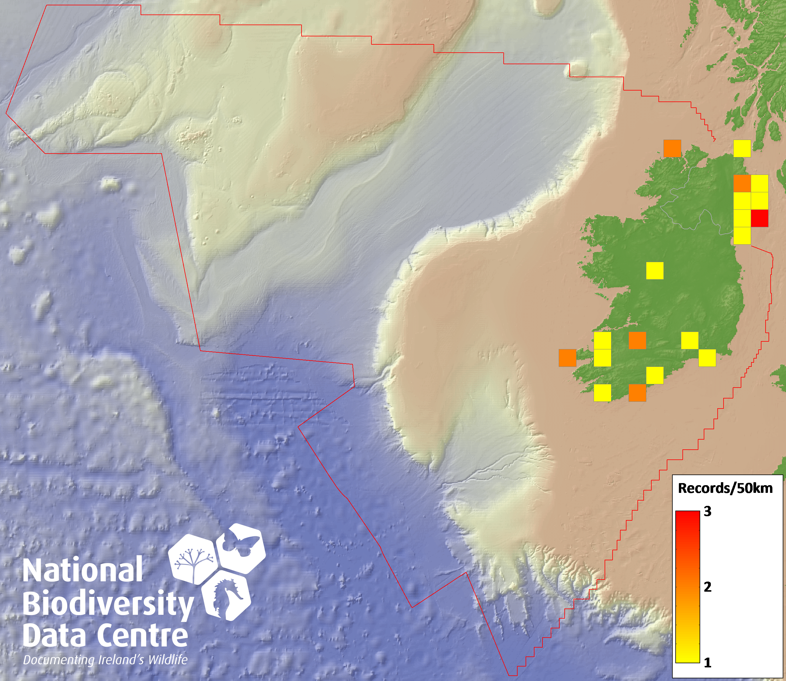 Distribution of the number of records recorded within each 10km grid square (ITM).Marine Map - 50km