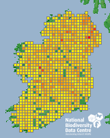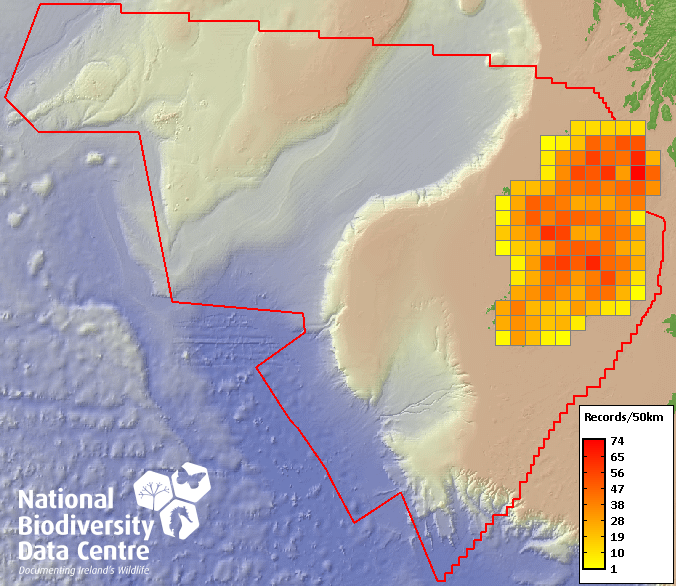 Distribution of the number of records recorded within each 10km grid square (ITM).Marine Map - 50km