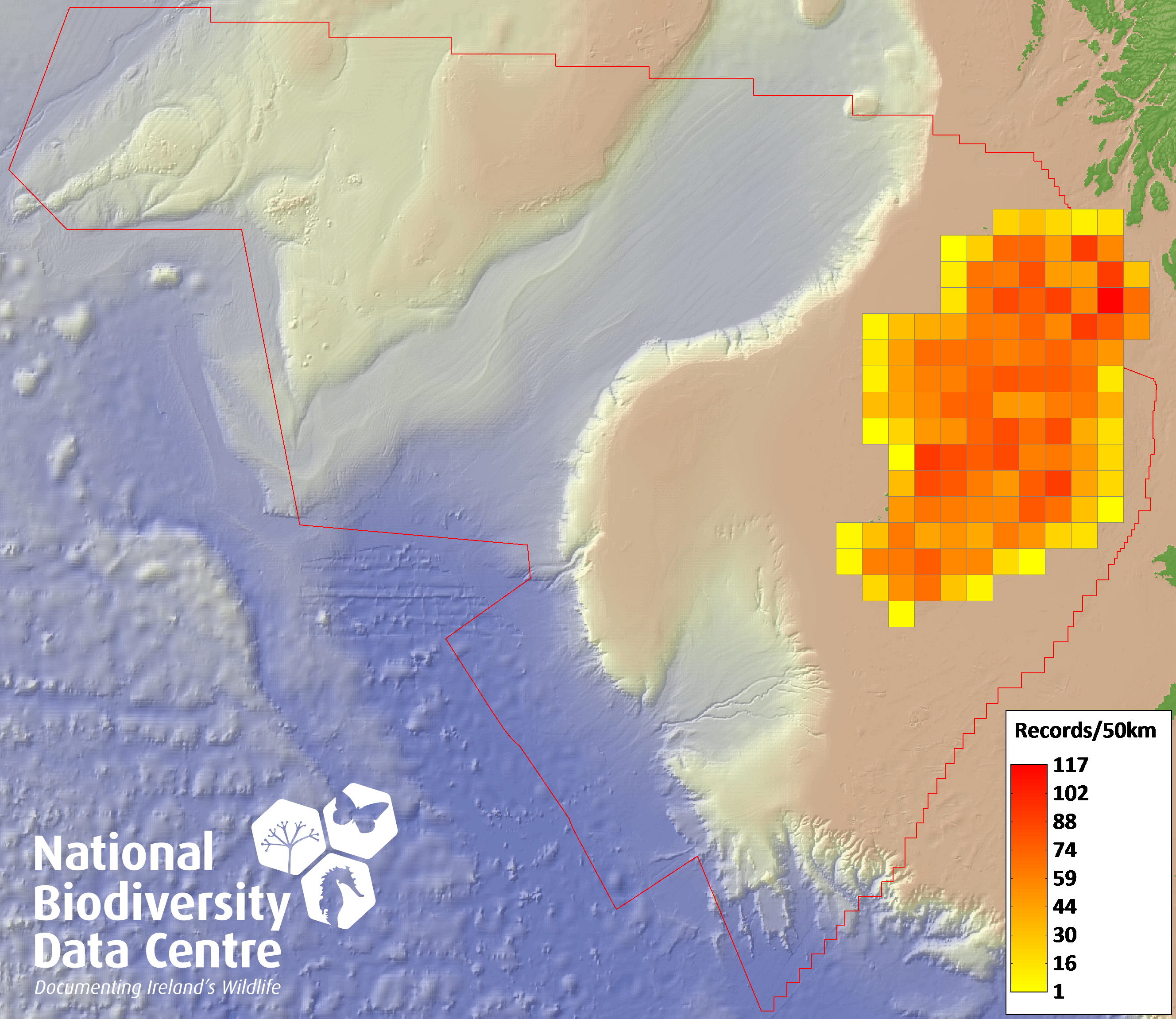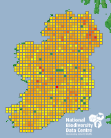 Distribution of the number of records recorded within each 10km grid square (ITM).Marine Map - 50km