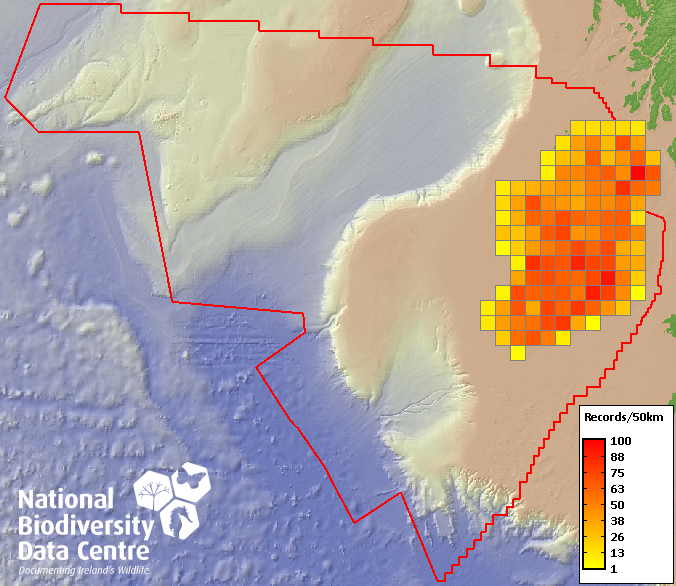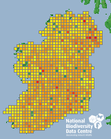 Distribution of the number of records recorded within each 10km grid square (ITM).Marine Map - 50km