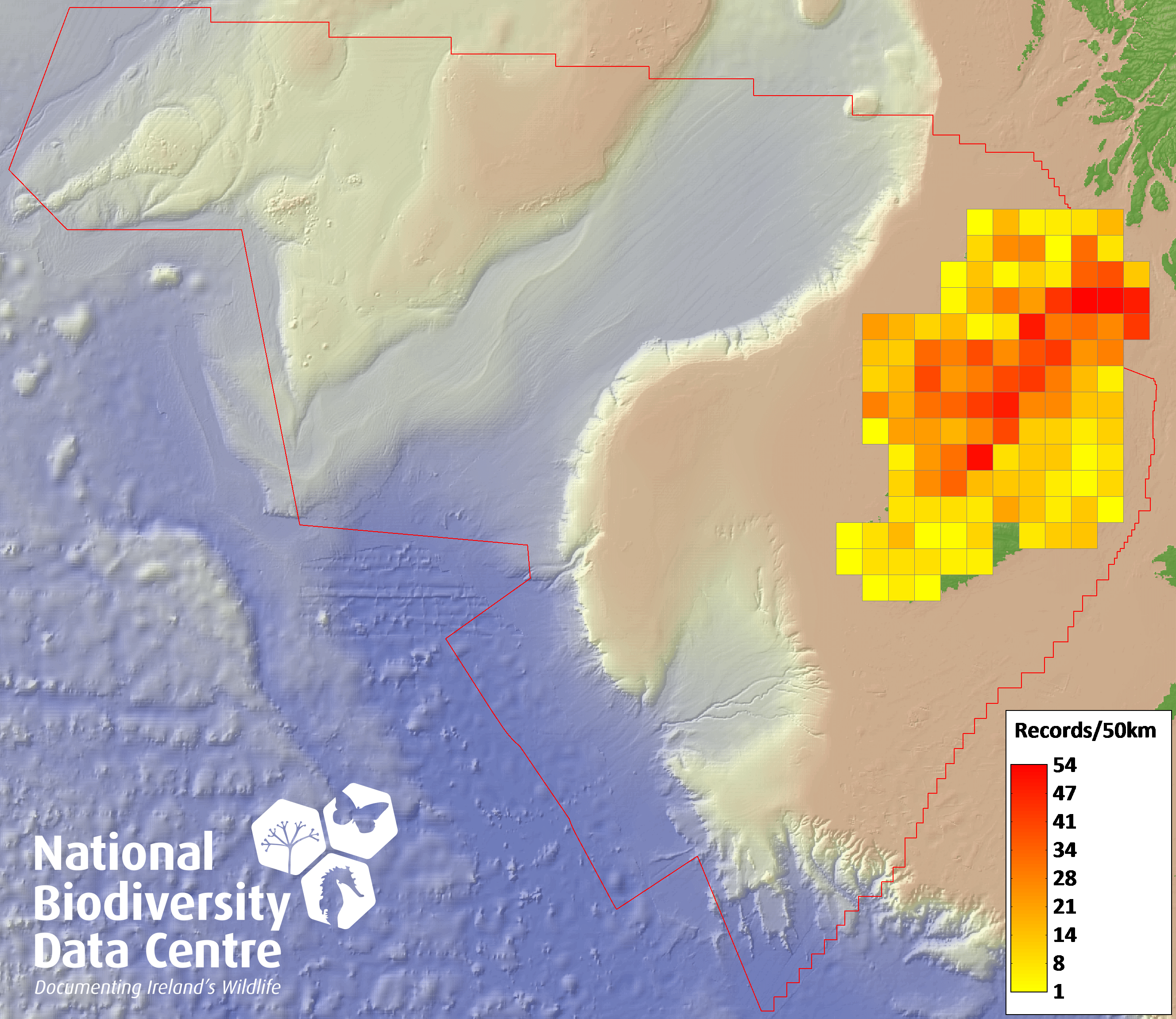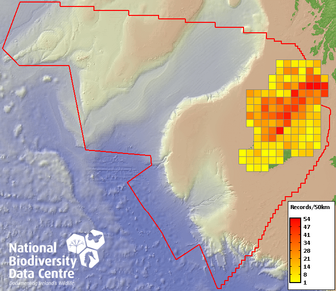 Distribution of the number of records recorded within each 10km grid square (ITM).Marine Map - 50km