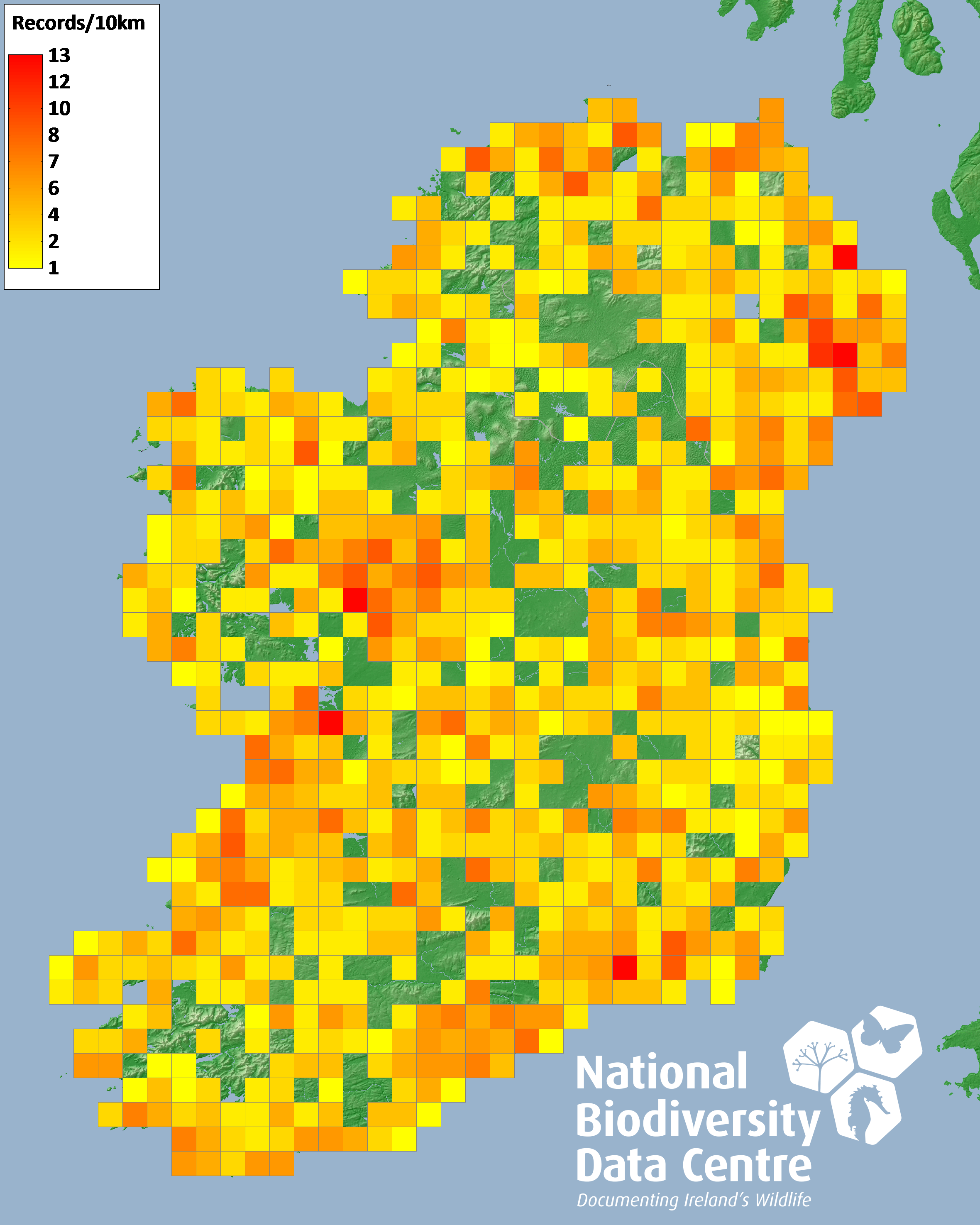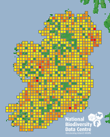 Distribution of the number of records recorded within each 10km grid square (ITM).Marine Map - 50km