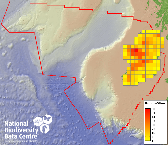 Distribution of the number of records recorded within each 10km grid square (ITM).Marine Map - 50km