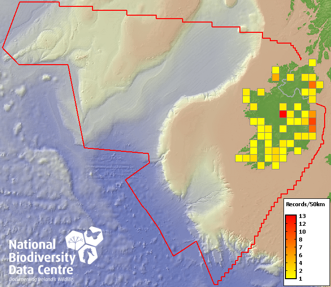 Distribution of the number of records recorded within each 10km grid square (ITM).Marine Map - 50km