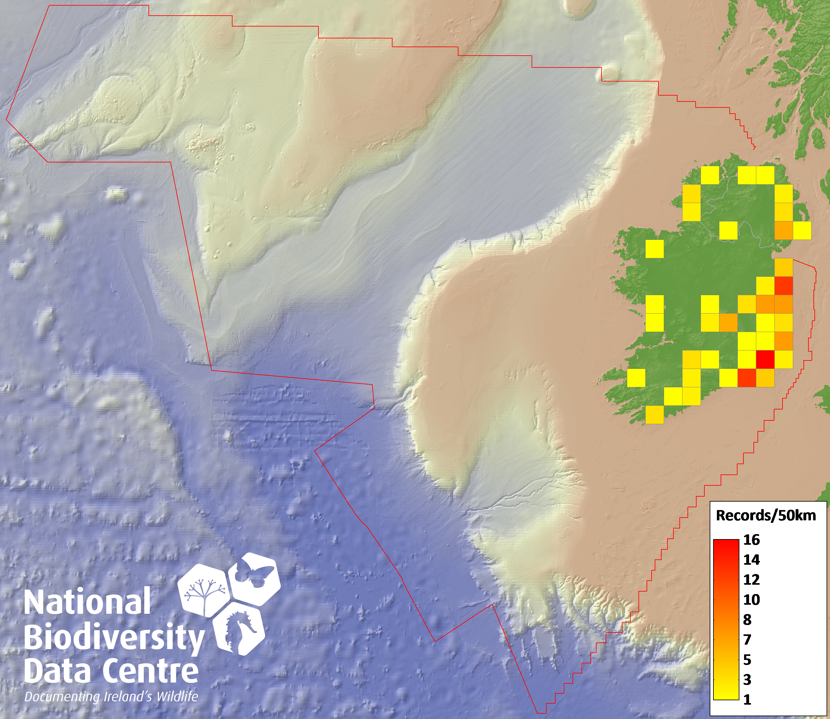 Distribution of the number of records recorded within each 10km grid square (ITM).Marine Map - 50km